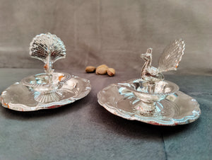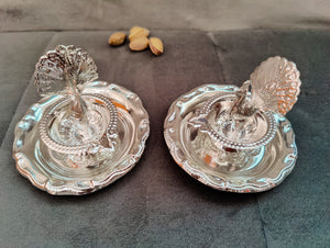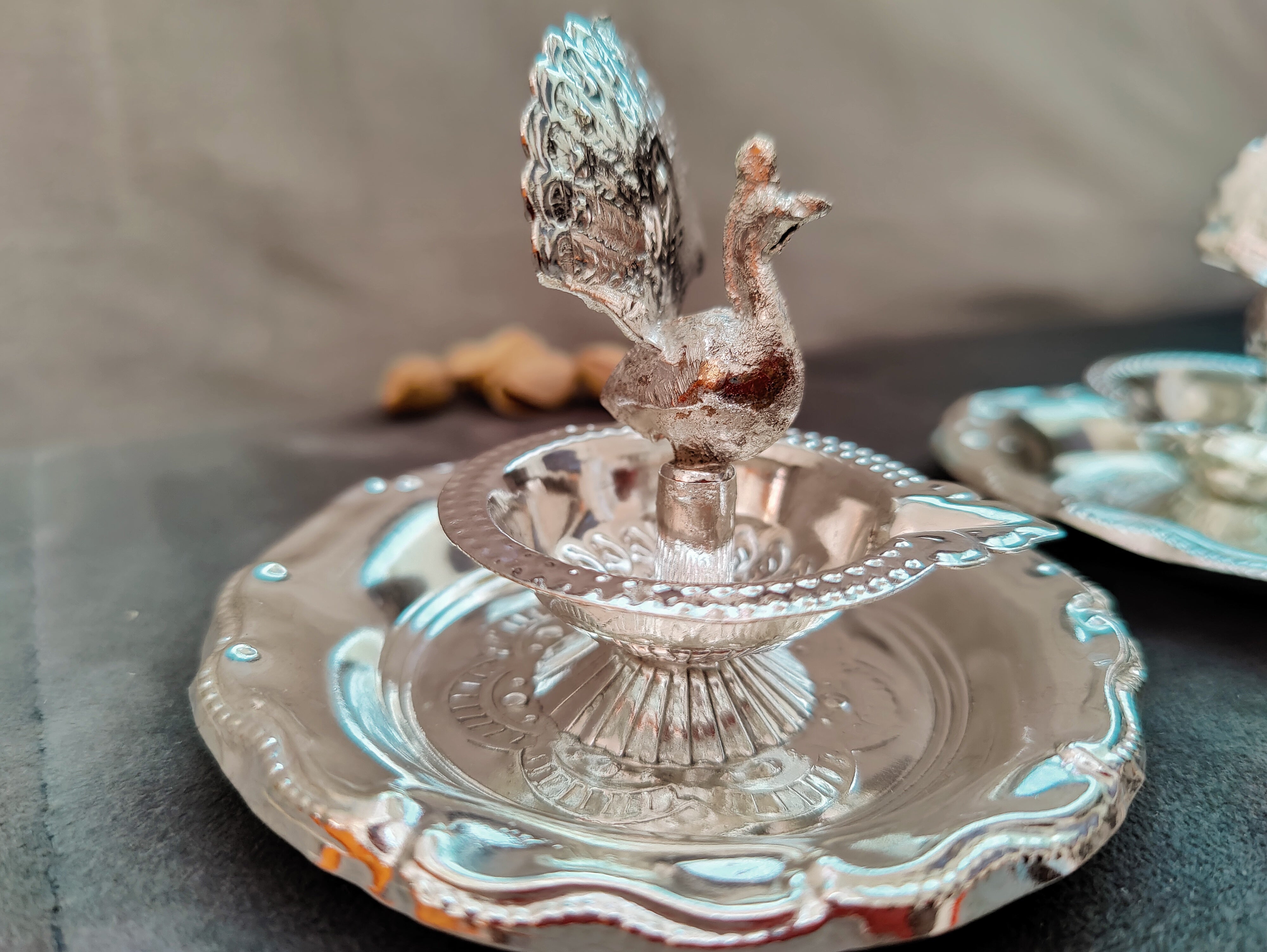 German silver washable peacock Deepam with plate attached ideal for lighting near door decor washable with colgate powder only ideal for return gifts for any occasion Daily use possible