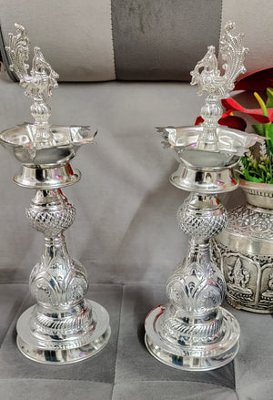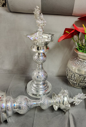 German silver washable fancy Deepam, naksi work done ideal for home pooja décor. Its a pure silver replica model.