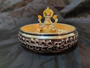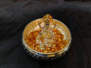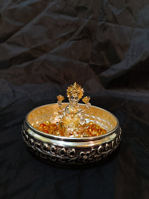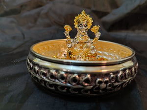 Antique German Silver Washable 5 Inch Urli + 2 Inch‚ 24kr Gold & Silver Coated Lakshmi Idol + 108 German Silver Washable Gold Mantra Flowers
