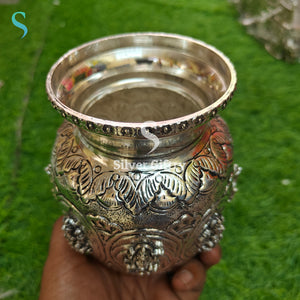 Antique German silver washable asta Lakshmi design kalsha stand special nakshi work done. Pure silver plated premium quality. Washable with water only life time usable. ideal for home pooja decor. Daily use possible.