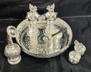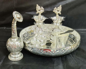 German silver washable 10inch plate + German silver washable 6inch fancy Deepam pair + 6.5inch paneer dani + 3inch panchawala+ panchapatra 4inch full combo set ideal for Home Pooja decor