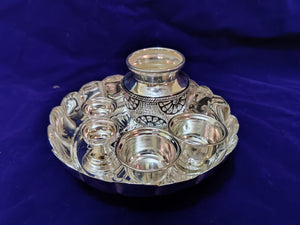 German Silver washable flower cut plate 10inch+ antique German Silver washable nakshi work done kalsha 3.8inch (note the design on kalsha is hand made it may vary from peice to peice) + 2.5inch Kum Kum bowls pair+ 2inch Nanda diya pair full combo set ideal for Home Pooja decor