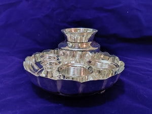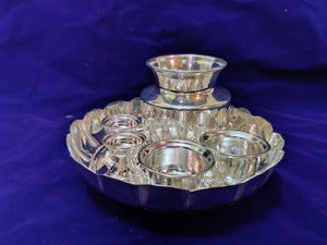 German Silver washable flower cut plate 10inch+ German Silver washable plain design kalsha 5inch + 2.5inch Kum Kum bowls pair+ 2inch Nanda diya pair full combo set ideal for Home Pooja decor