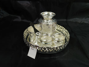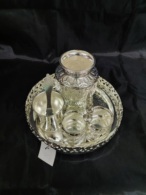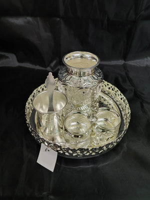 Impressive imported German Silver washable tray 10inch + 4.5inch astalakshmi design kalsha+panchwala 3inch+ panchapatra 4inchÂ