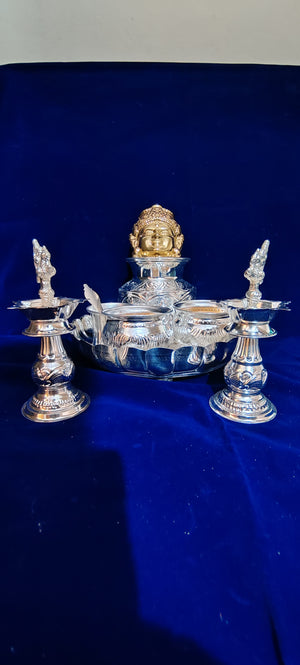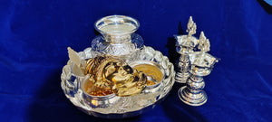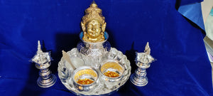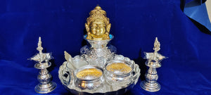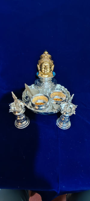 German silver washable flower cut plate8inch 3 inch Kum Kum bowls pair+ Astalakshmi kalsha 4inch+ German silver washable gold 7inch face+ 7inch Deepam pair+ 108 gold Mantra flowers+panchapatra