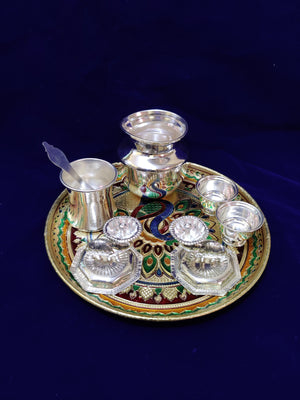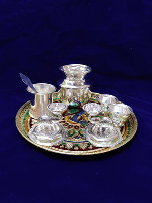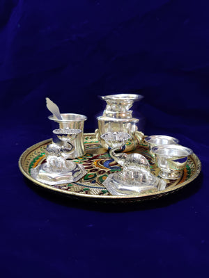 Meenakari work done plate 12inch+ German Silver washable plain design kalsha 4inch + 3inch panchapatra+4inch elephant Devdas diya pair+2inch German Silver washable Kum Kum bowls pair combo set ideal for Home Pooja decor