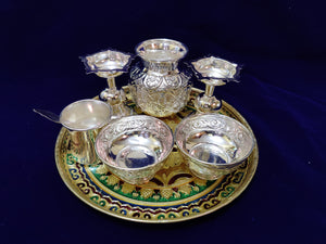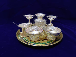 Meenakari work done plate 12inch+ German Silver washable astalakshmi design kalsha 4.5inch + 3inch panchapatra+5inch fancy Devdas diya pair+4inch German Silver washable Kum Kum bowls with standpair combo set ideal for Home Pooja decor
