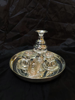 German Silver washable 10inch plate +elephant Devdas diya 4" pair + lakshmi agarbatti stand 3inch+ 5inch‚ fancy ombaley kalsha combo set ideal for wedding decor‚