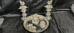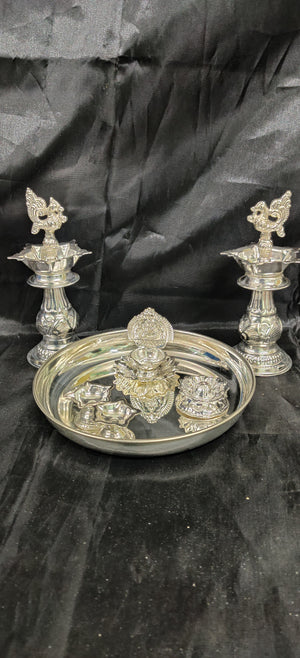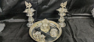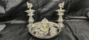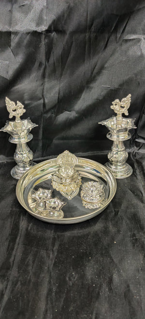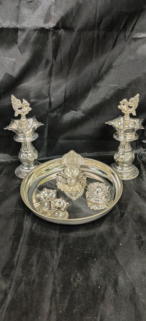 German Silver washable plate 8" + fancy design Deepam 6" + 2.5inch kamakshi Deepa+ Star Deepam pair+ aggarbathi stand