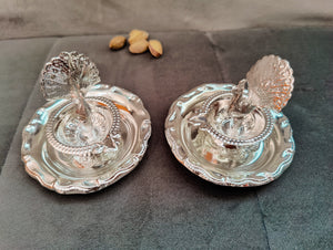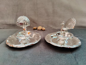 German silver washable peacock Deepam with plate attached ideal for lighting near door decor washable with colgate powder only ideal for return gifts for any occasion Daily use possible