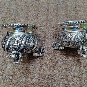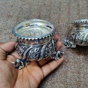 Antique German silver washable nakshi work done fancy design Elephant leg Kum bowls. Pure silver plating Done by sgt hand made design. Pure silver plating Done by sgt. Note (sgt antique German silver washable articles are pure silver polished) life time usable ideal for home pooja decor. Daily use possible.