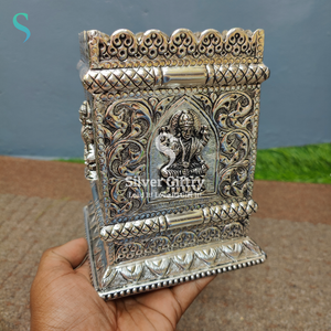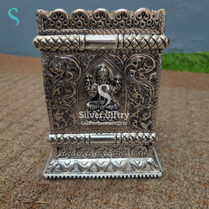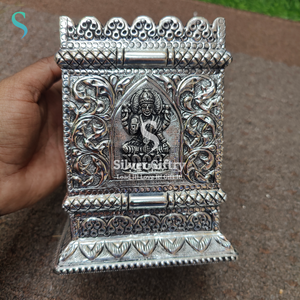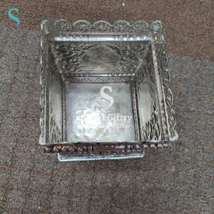 Antique German silver washable nakshi work done limited edition tusli pot with Lakshmi design 4 side Pure silver plating Done by sgt Can place real plant daily usable hand made design Pure silver plating Done by sgt. Note (sgt antique German silver washable articles are pure silver polished) life time usable ideal for home pooja decor. Daily use possible