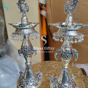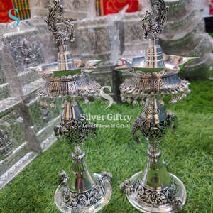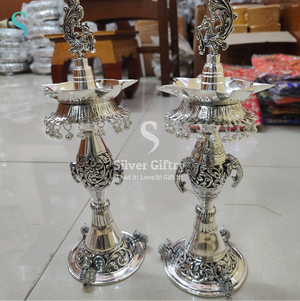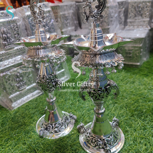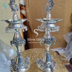 Antique German silver washable nakshi work done spl nakashi work donw deepam with peacock Design head + elephant idols on leg modle Pure silver plating Done by sgt hand made design Pure silver plating Done by sgt. Note (sgt antique German silver washable articles are pure silver polished) life time usable ideal for home pooja decor. Daily use possible