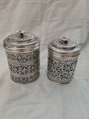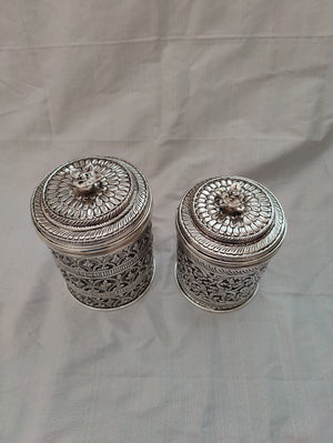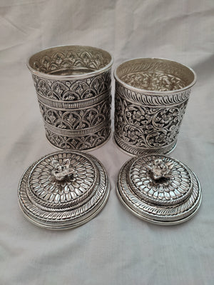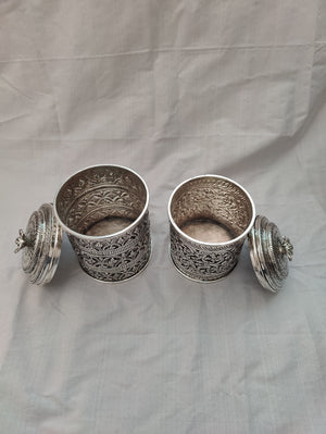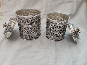 German silver washable nakshi work Done dry fruits dabbis set of 2 (big and medium size) storage boxes ideal for home decor Note (sgt antique German silver washable articles are pure silver polished) life time usable ideal for return gifts for any occasion. Daily use possible