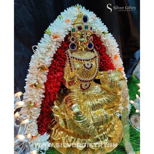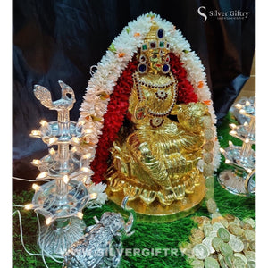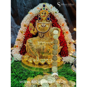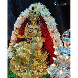Impressive imported Lakshmi idol extra big size 14 inch with extra stone work done by Silver Giftry, Stone necklace, Thomala 10 inch, 108 Gold kuber Lakshmi coins, 3 step lighting diya and a 3 inch Elephant pair