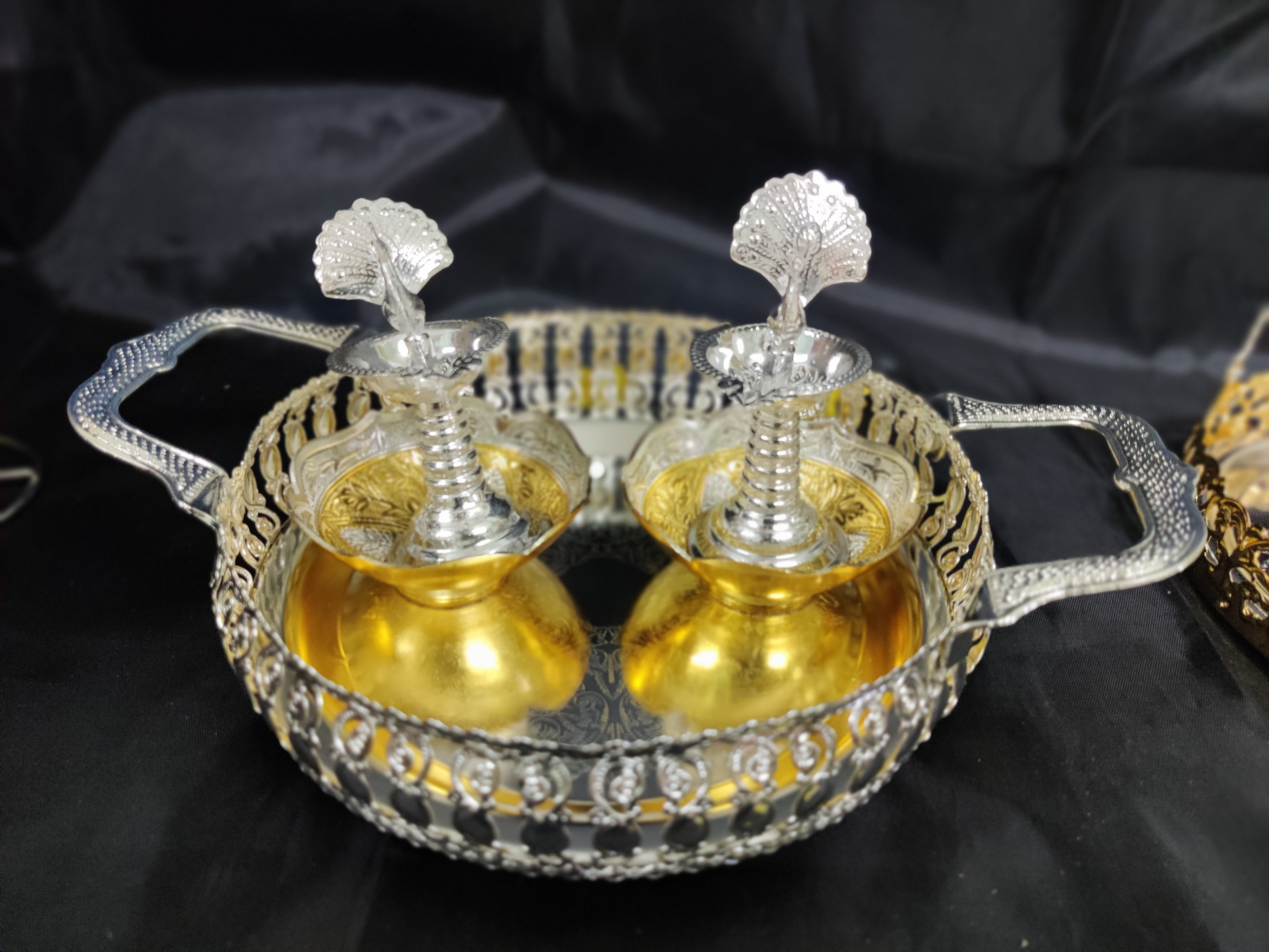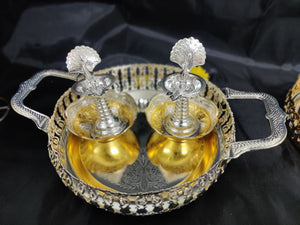 Impressive imported German silver washable round tray with handle 10inch + 4inch German silver washable gold bowls+ 5inch peacock samey diya pairÂÂ