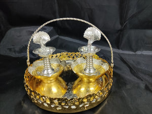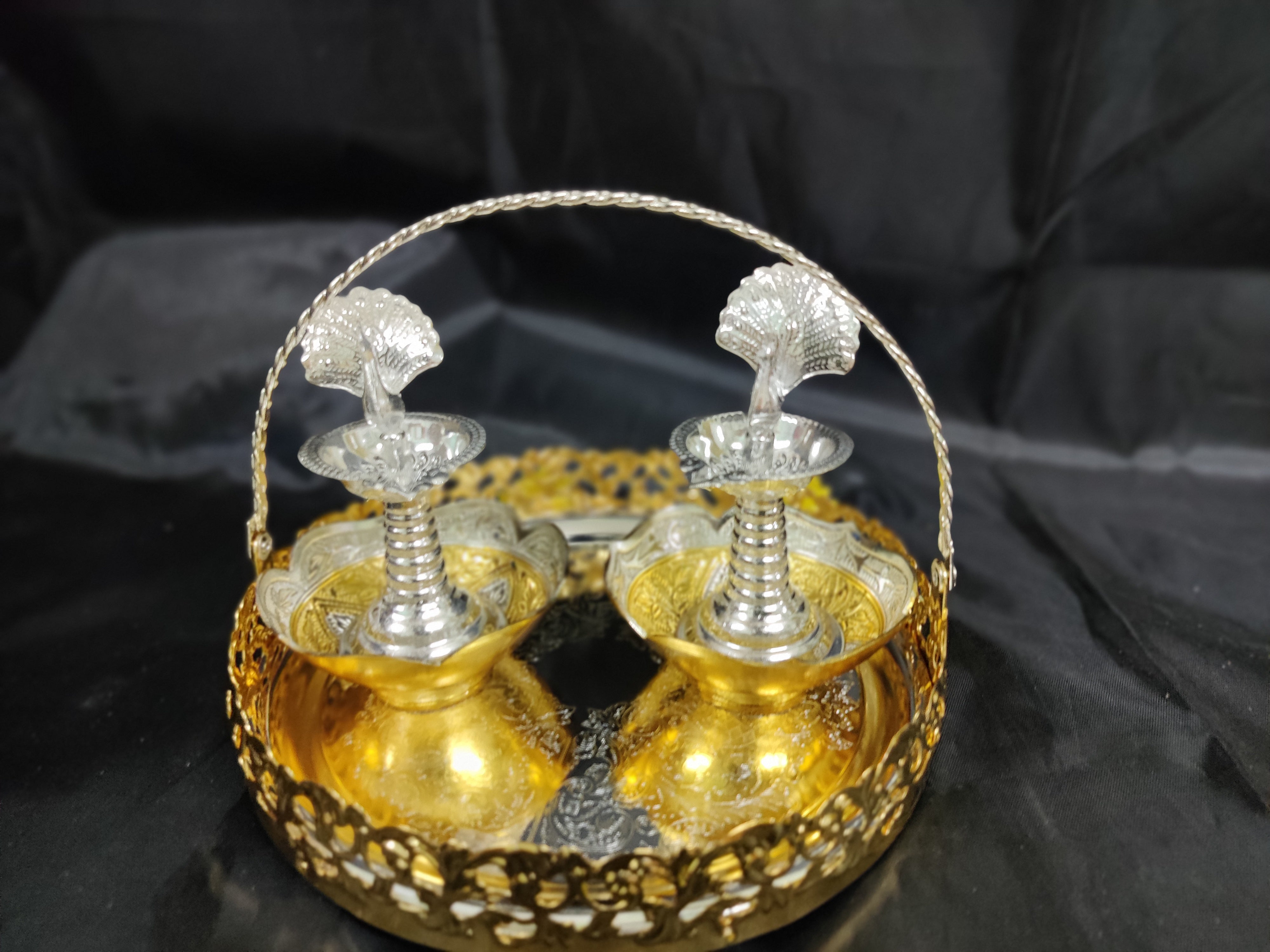 Impressive imported German silver washable round tray with handle 8inch + 4inch German silver washable gold bowls+ 5inch peacock samey diya pairÂÂ