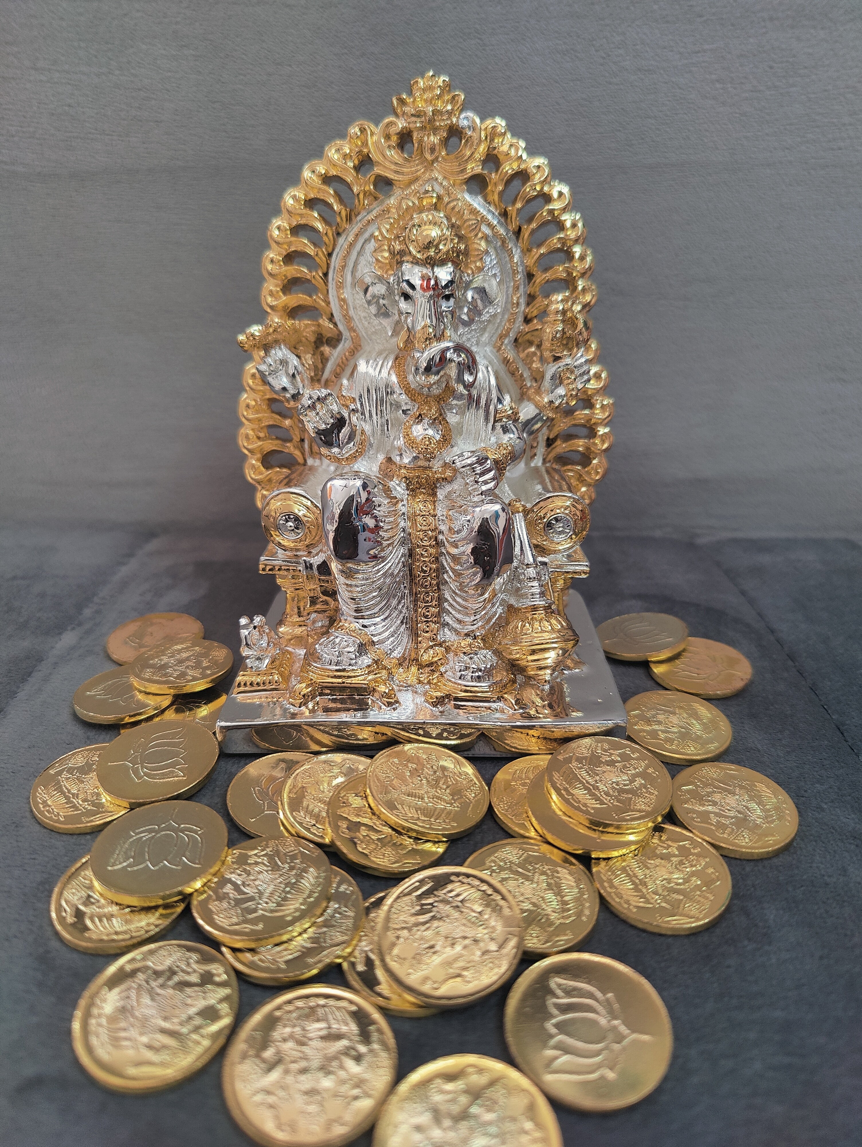 Pure silver coated maharaj ganesh idol with shimasana + 108 gold Mantra Kuber coins Gold and silver Ganesh idol combination idols ideal for home pooja decor ideal for return gifts for any occasion. Daily use possible
