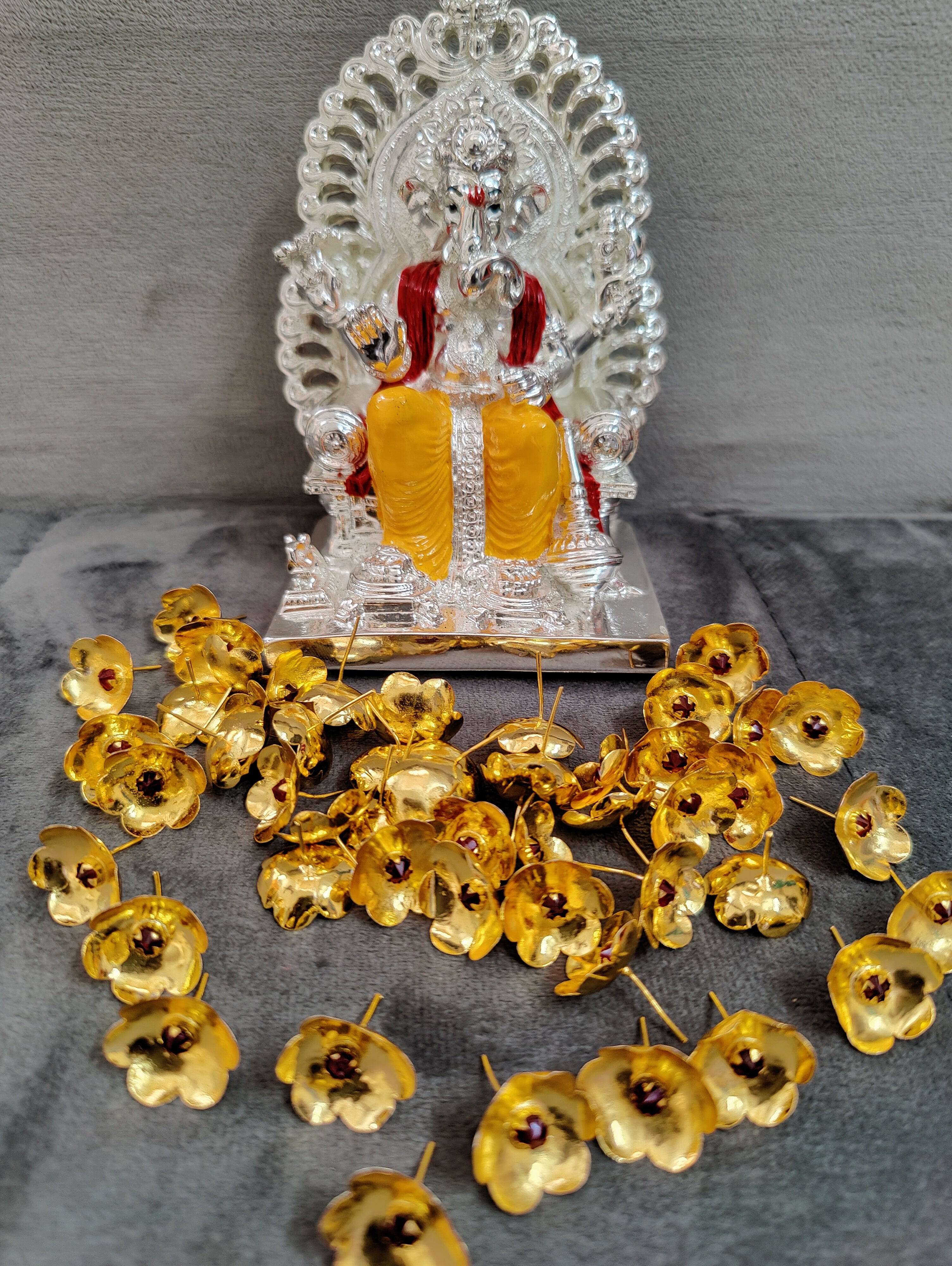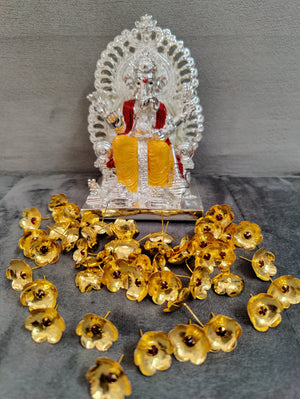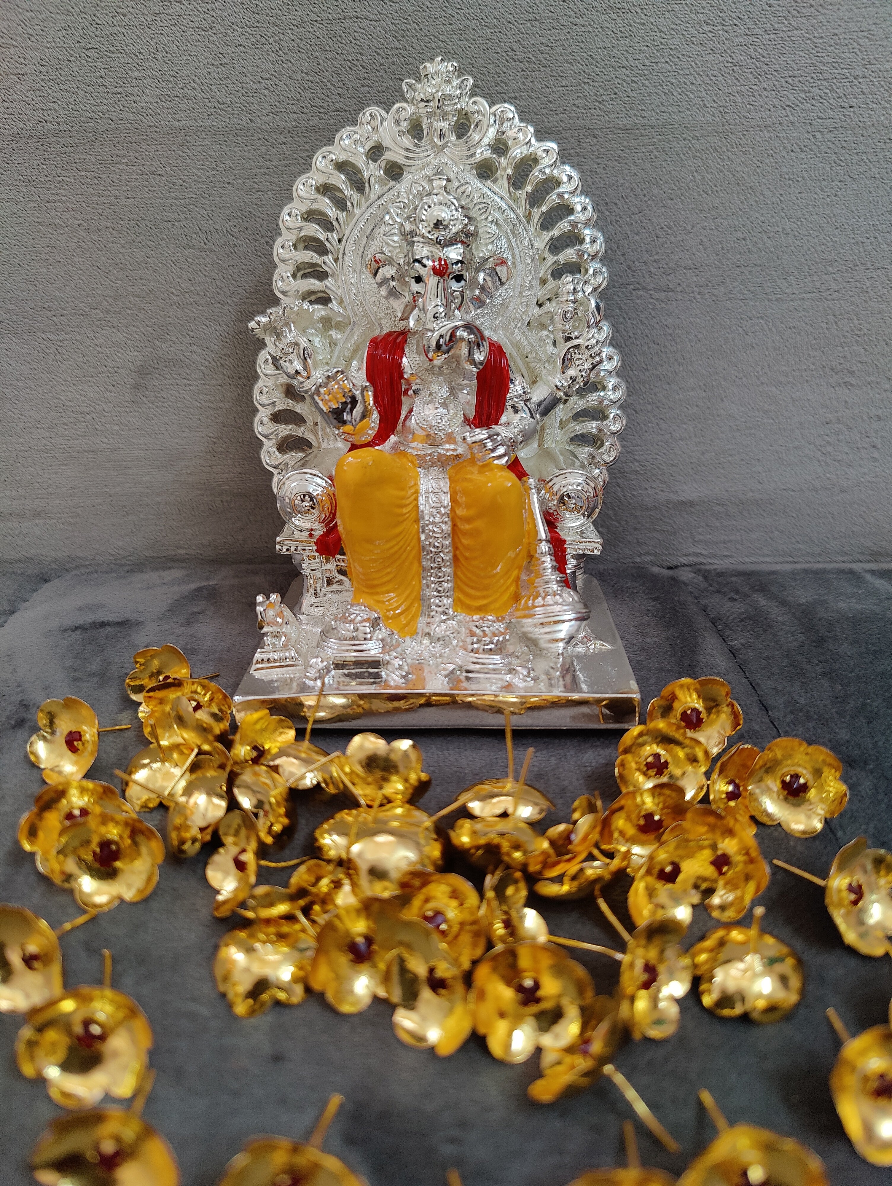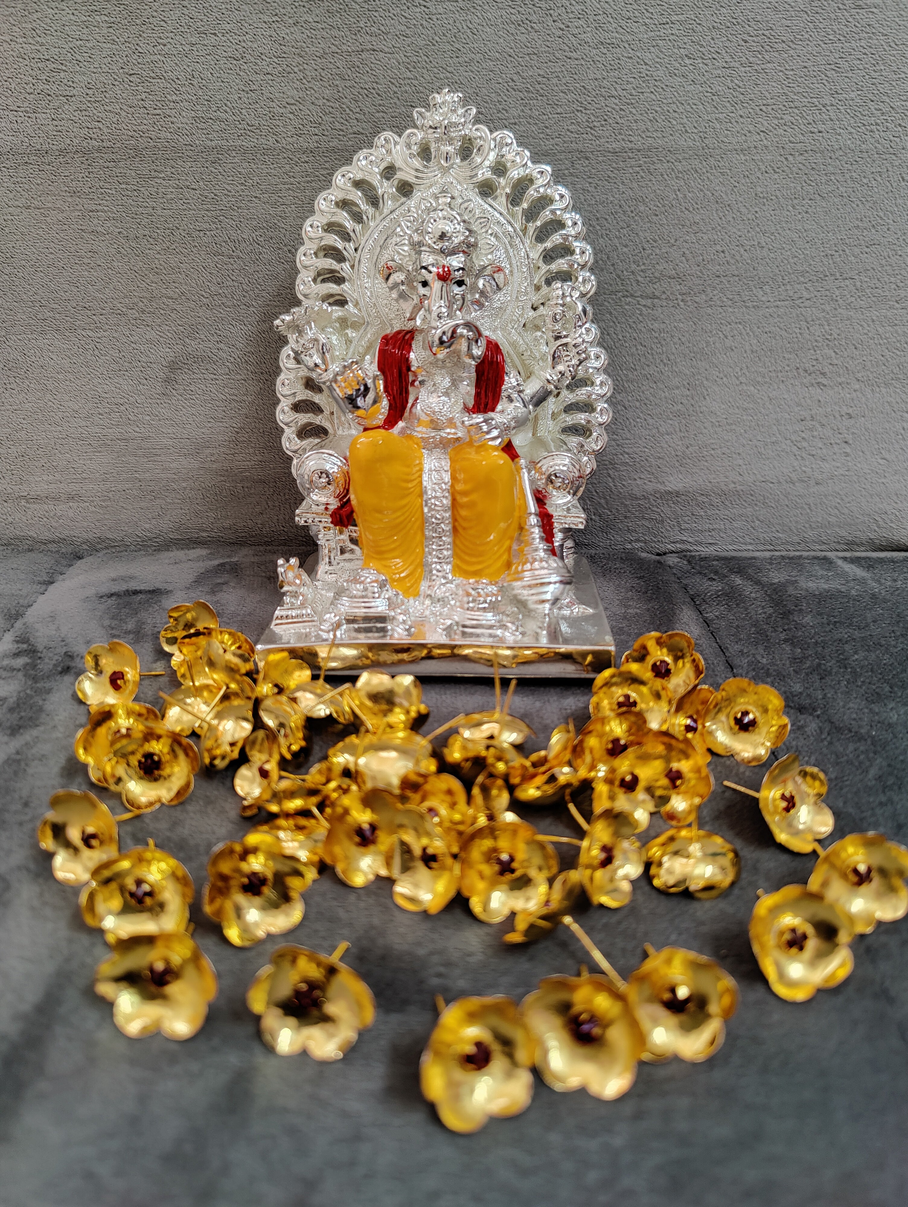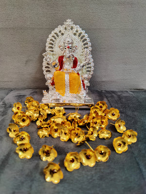 Pure silver coated maharaj ganesh idol with shimasana + 108 gold Mantra stoned flowers. Red and yellow on silver combination idols ideal for home pooja decor ideal for return gifts for any occasion. Daily use possible