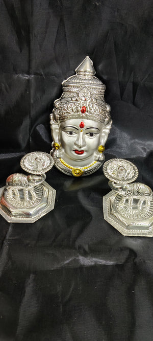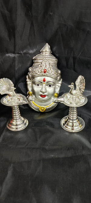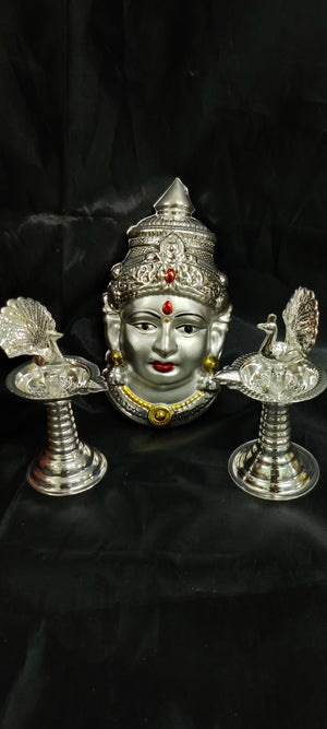 German silver washable lakshmi face pearl finish 7inch + 5inch peacock samey diya pair 5" Full set ideal for return gifts for any occasion or home pooja decor