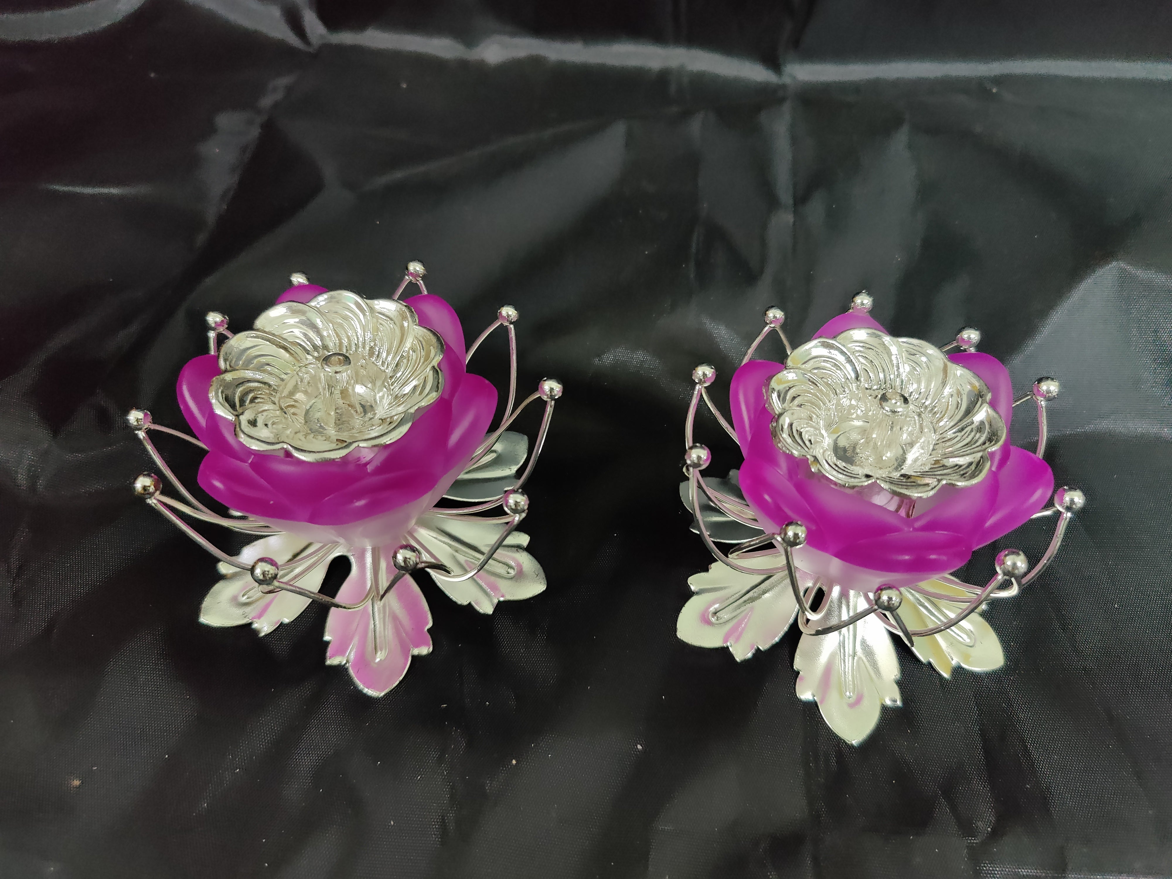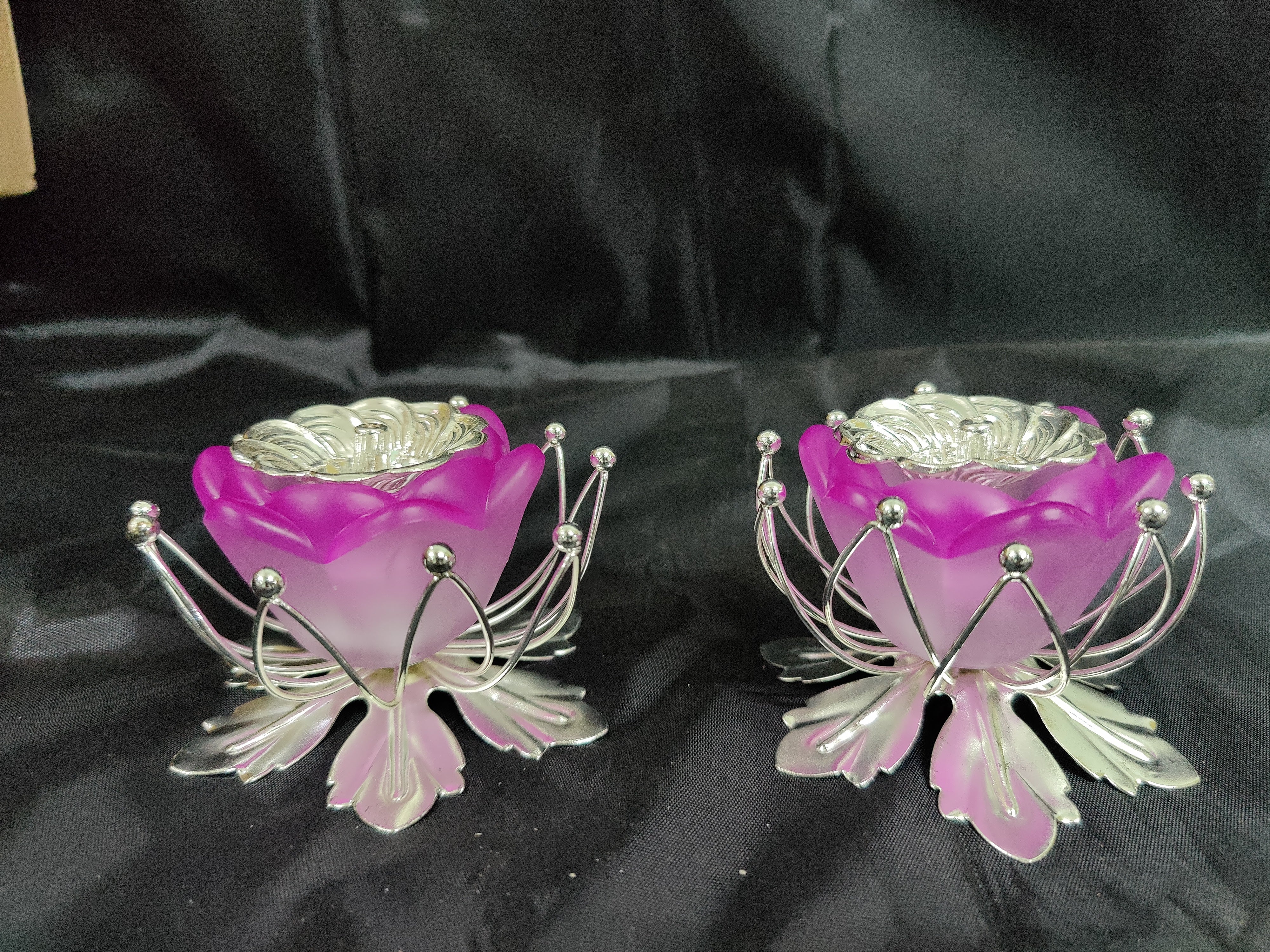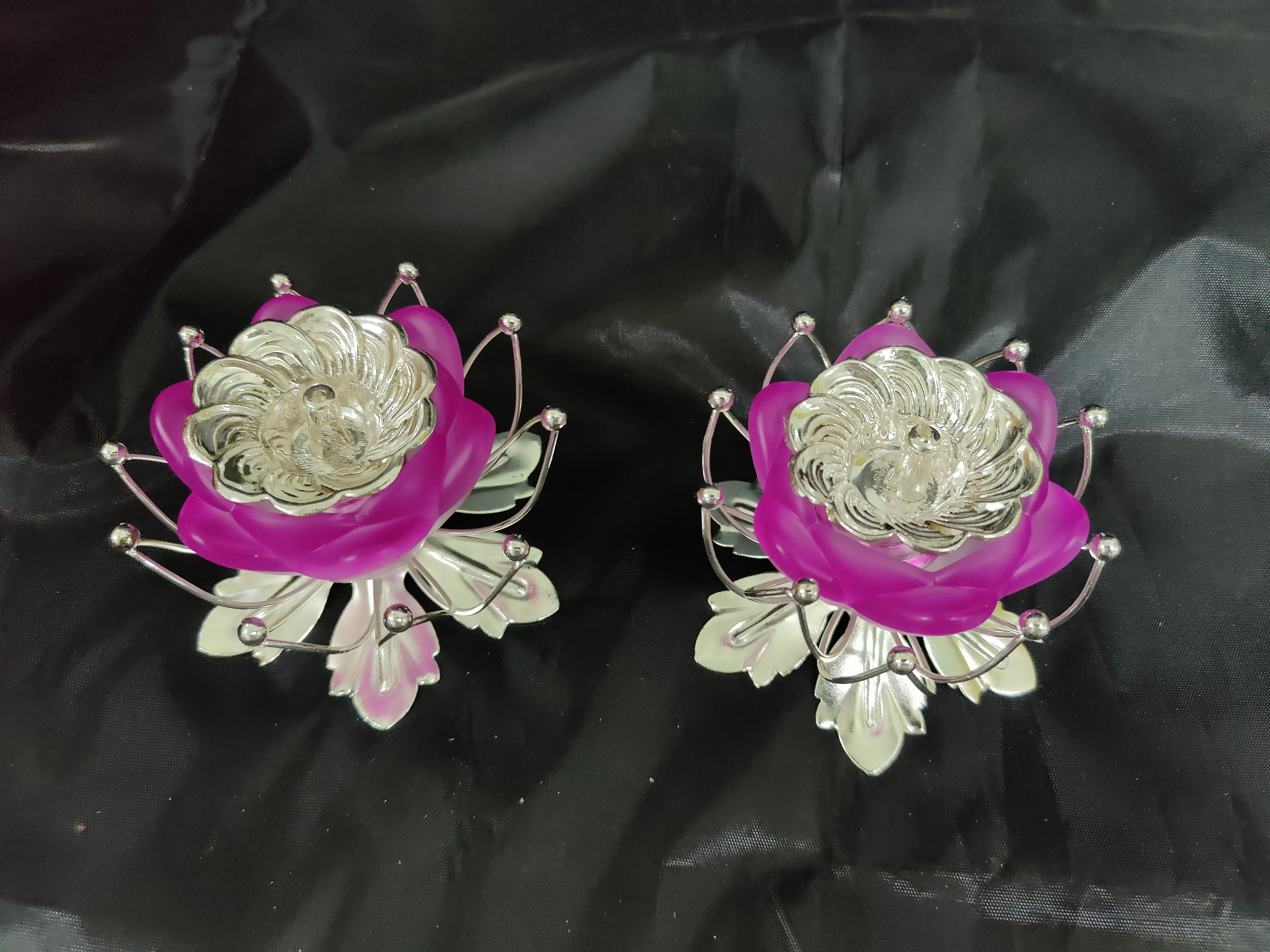 German Silver Lotus Stand With Fancy Diya Pair