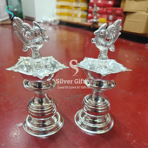 German silver washable fancy Deepa with peacock head 6.5inch height life time colour unchanging. Washable life time usable ideal for home pooja decor. Daily use possible