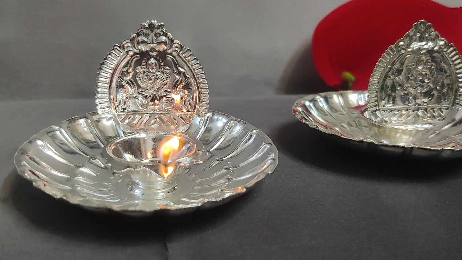 7" German Silver Lakshmi Kamakshi Diya with Plate & 108 Flowers