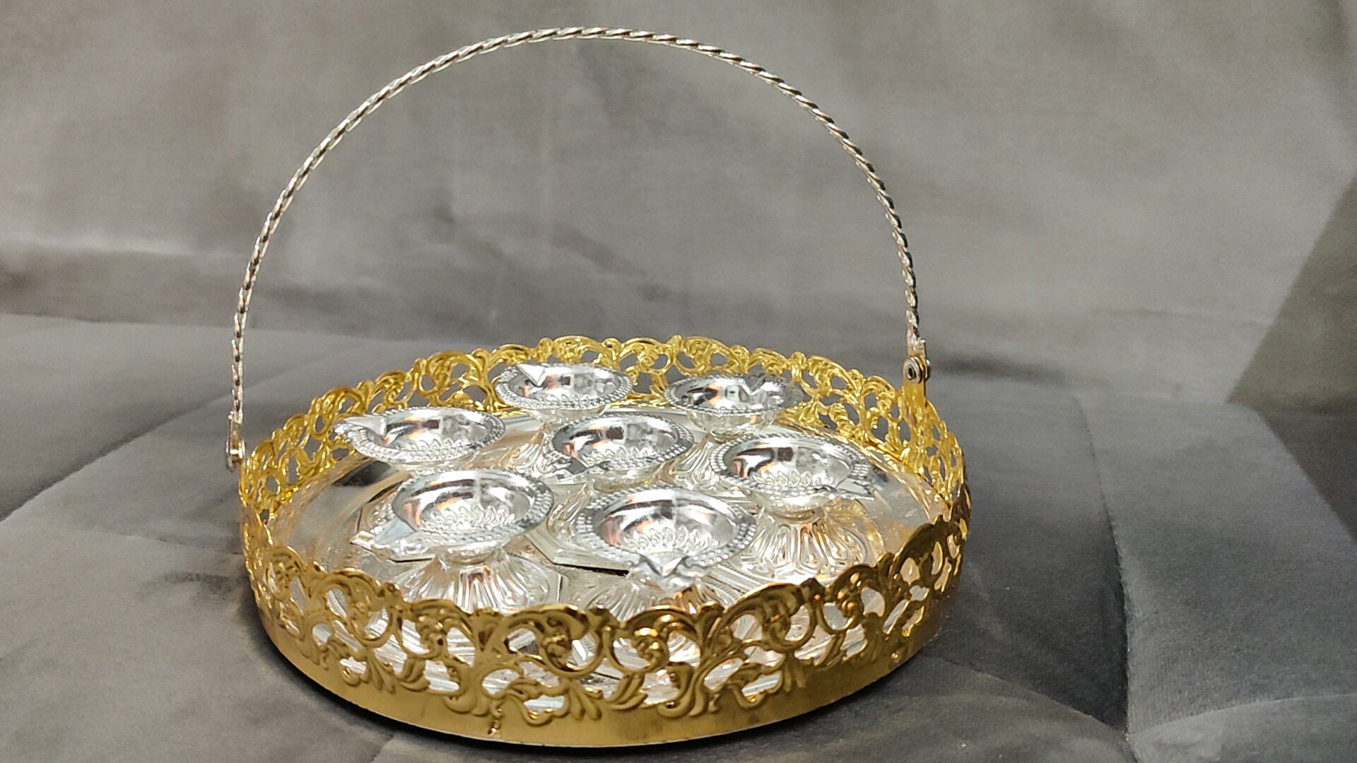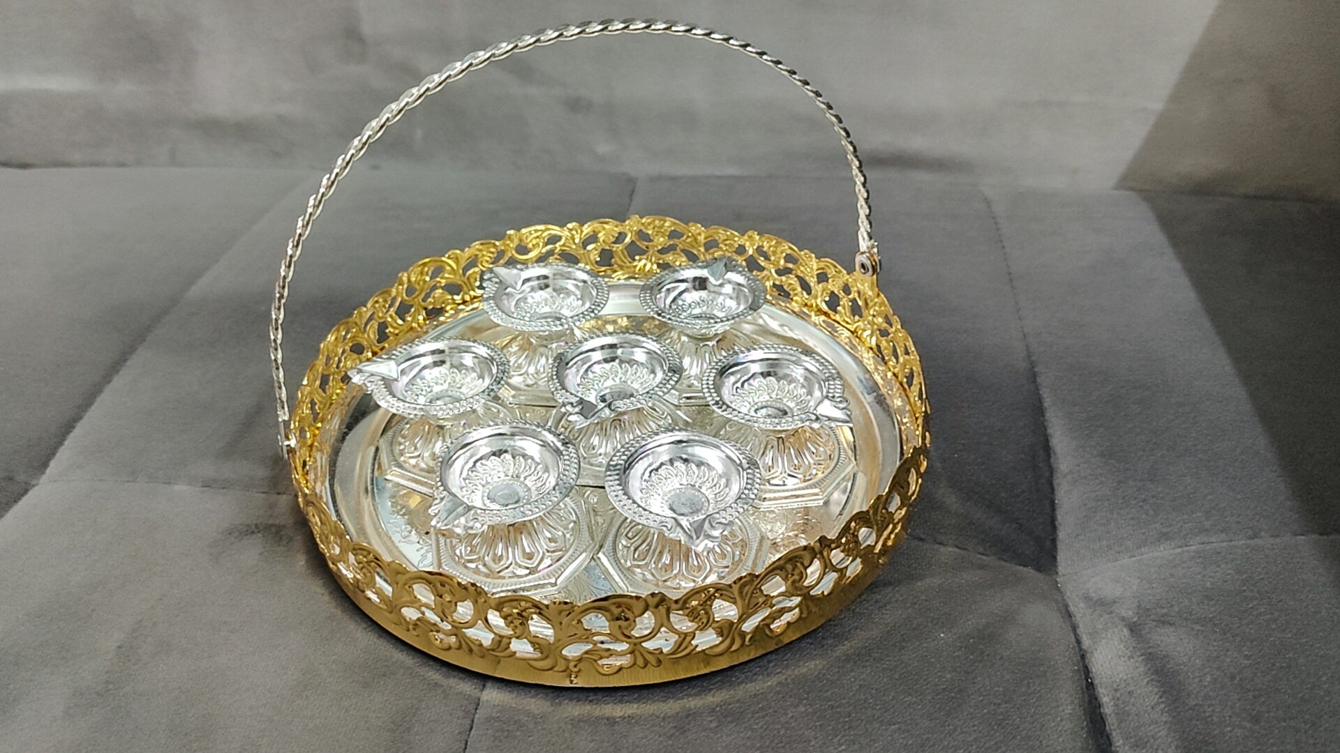 Imported German silver washable tray 9inch with handle + German silver deepam 2" with stand (7 pcs) ideal for return gifts for any occasion Daily use possible Washable with water