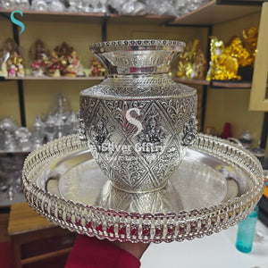 Antique German silver washable ashtalakshmi design big size kalsha 8-9inch pure silver coated premium quality life 15 years With imported German silver washable tray 12-13inch life time usable ideal for home pooja decor. Daily use possible