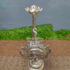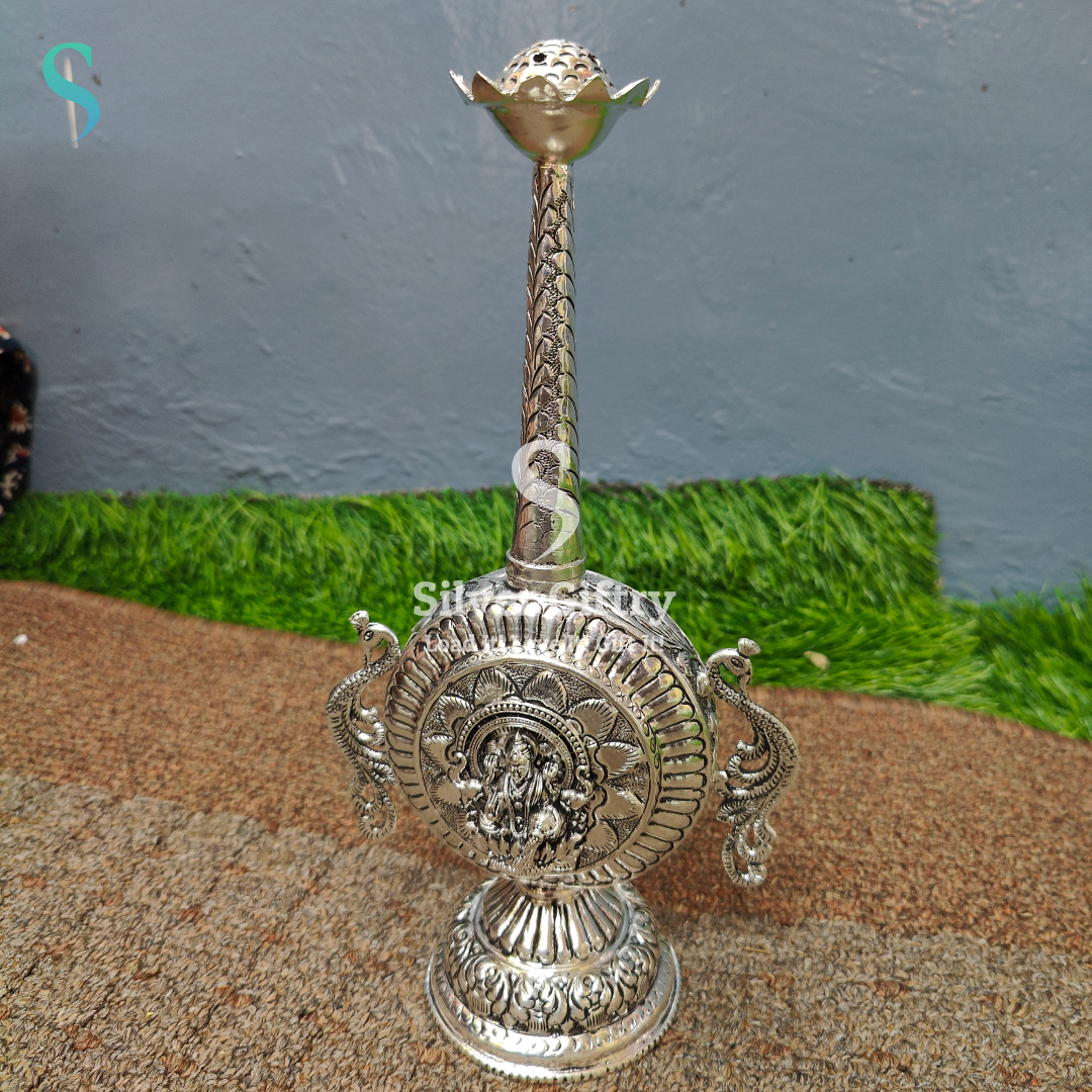 Antique German silver washable nakshi work done spl nakashi work done panner dispenser gajalakshmi Design Pure silver plating Done by sgt hand made design. Pure silver plating Done by sgt. Note (sgt antique German silver washable articles are pure silver polished) life time usable ideal for home pooja decor. Daily use possible