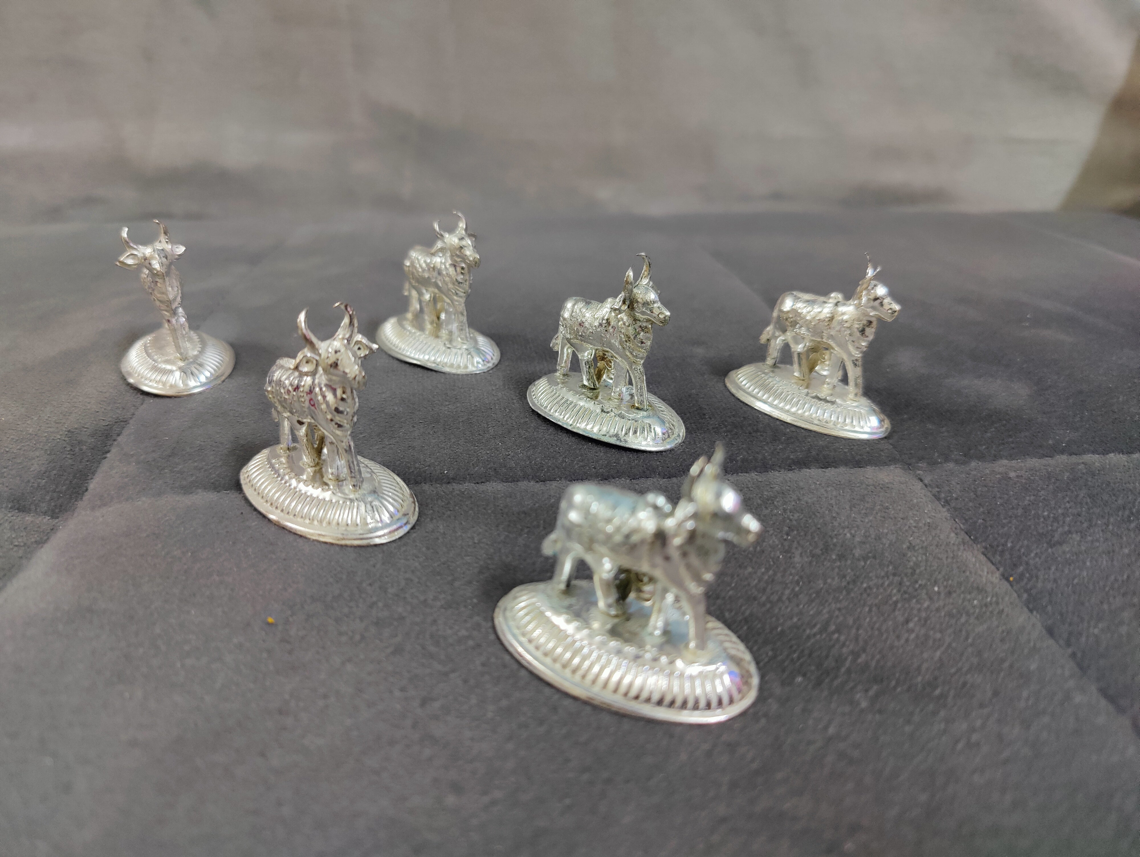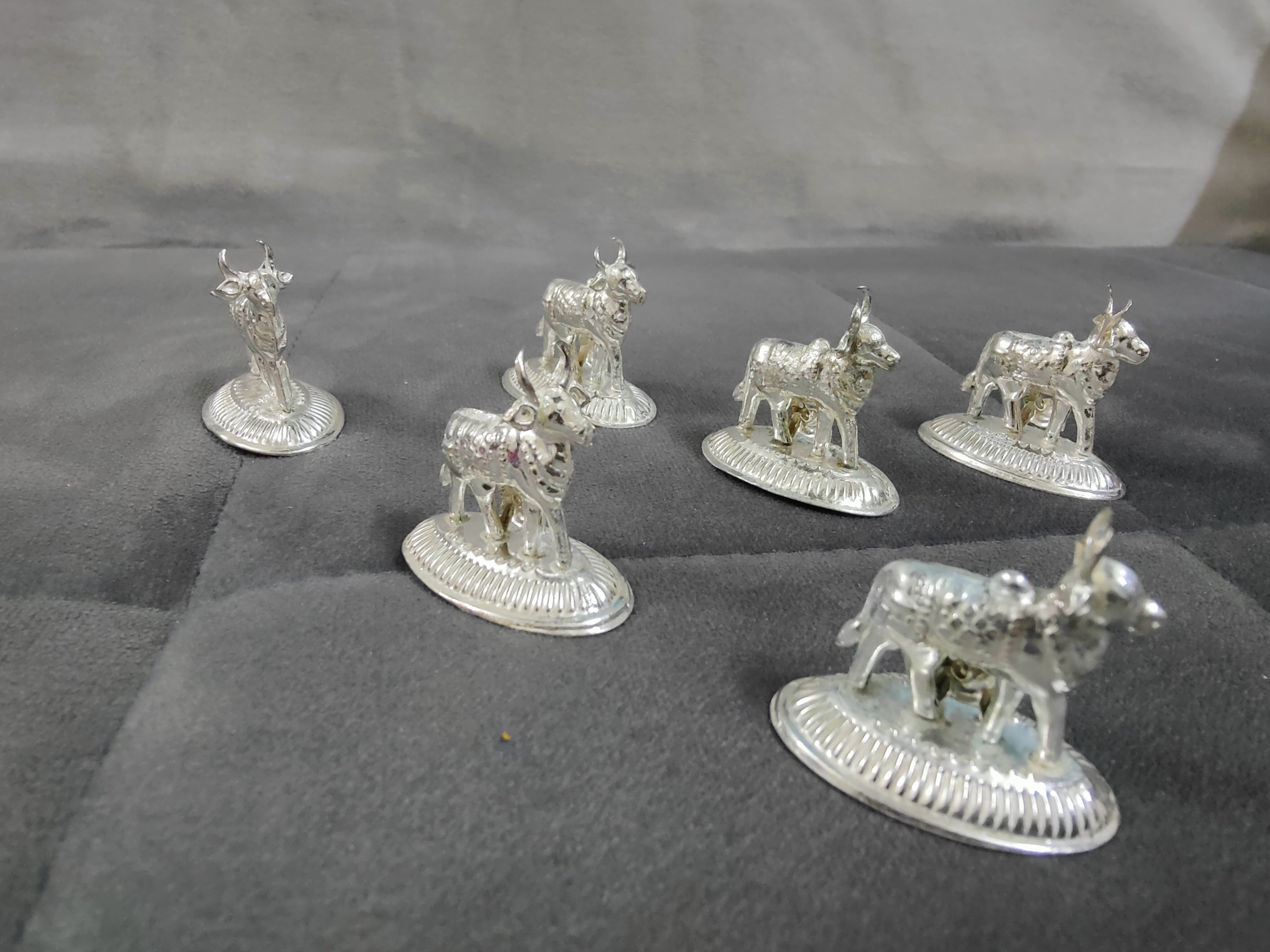 German silver fancy design cow and calf set of 10 pcs Return gifts option for any occasion life time usable ideal for home pooja decor. Daily use possible