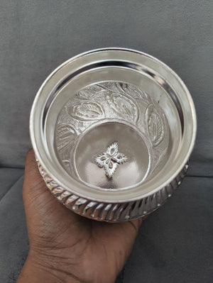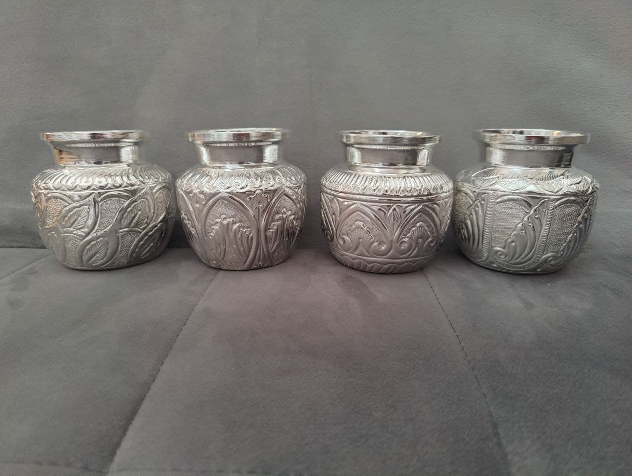 German silver washable fancy design kalsha (note the design on kalsha changes peice to peice hence it's hand made design). Capacity of 1ltr. Washable with colgate powder only. Daily use possible