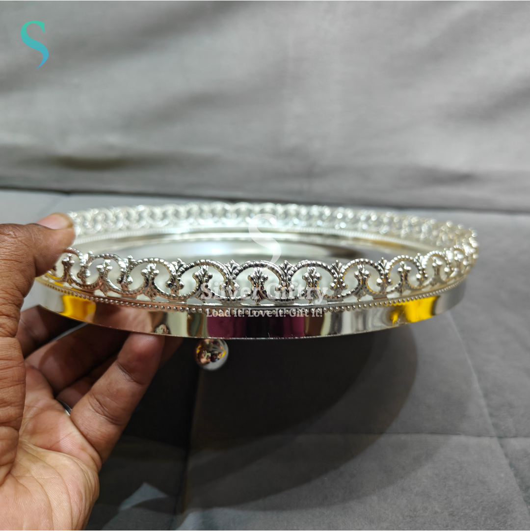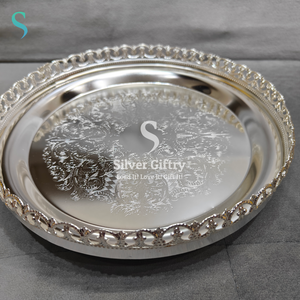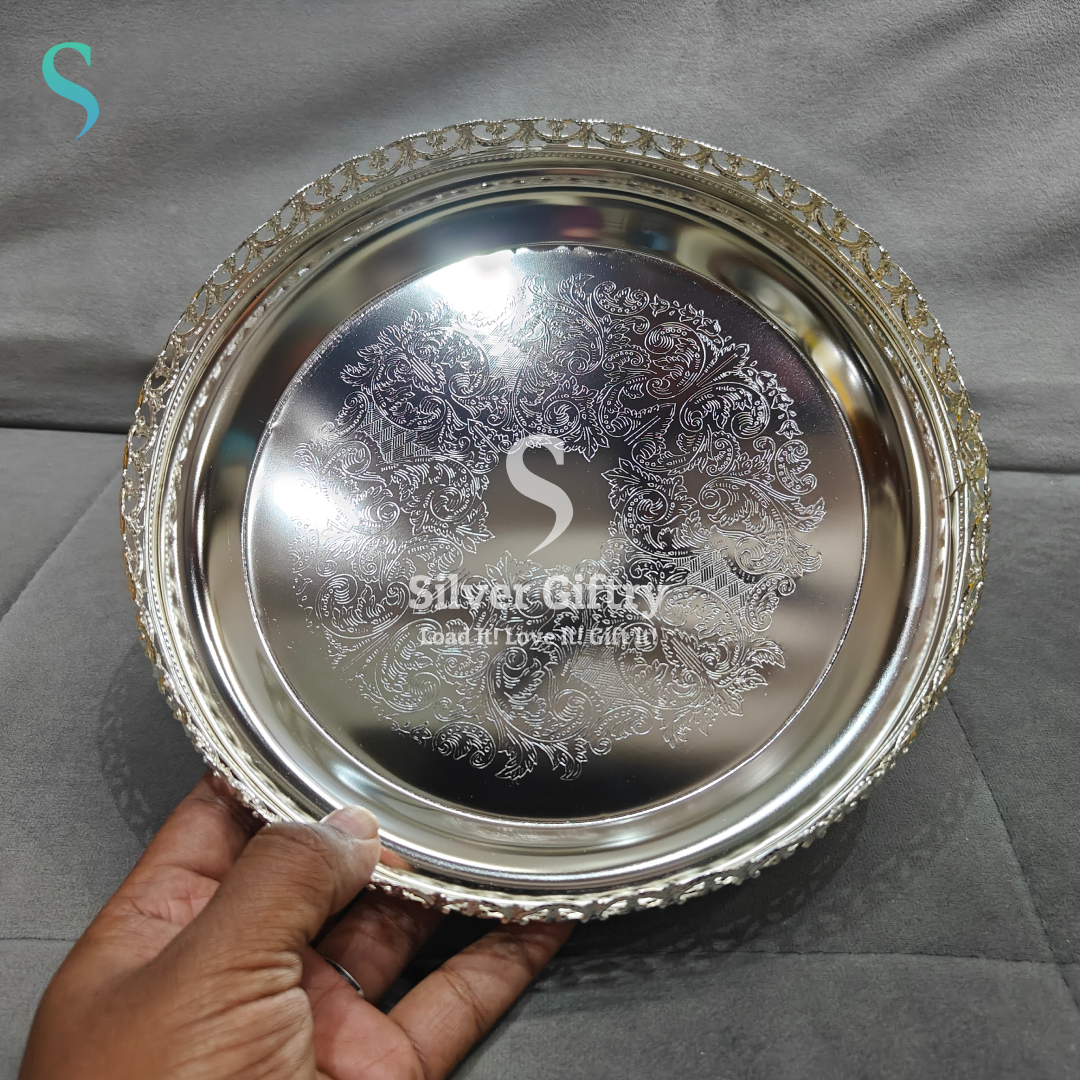 Imported German silver washable wedding tray 9inch with legs ideal for Pooja decor Note (washable with Colgate powder only) life time usable ideal for home pooja decor Daily use possible