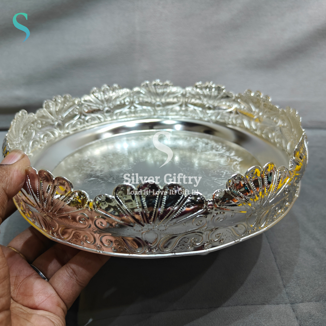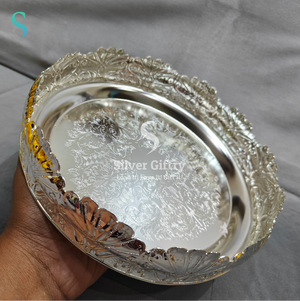 Imported German silver washable wedding tray 9inch with legs ideal for Pooja decor Note (washable with Colgate powder only) life time usable ideal for home pooja decor Daily use possible