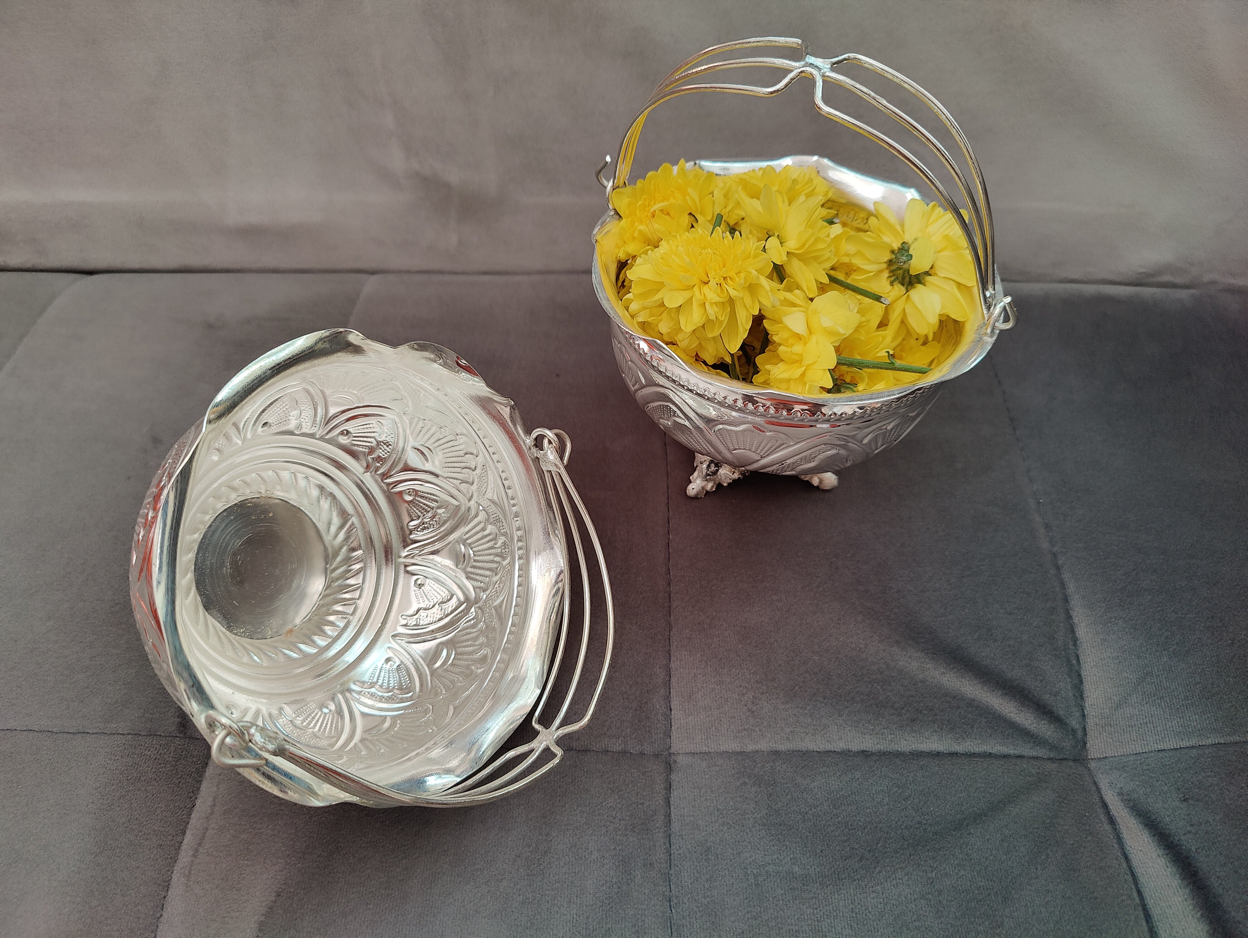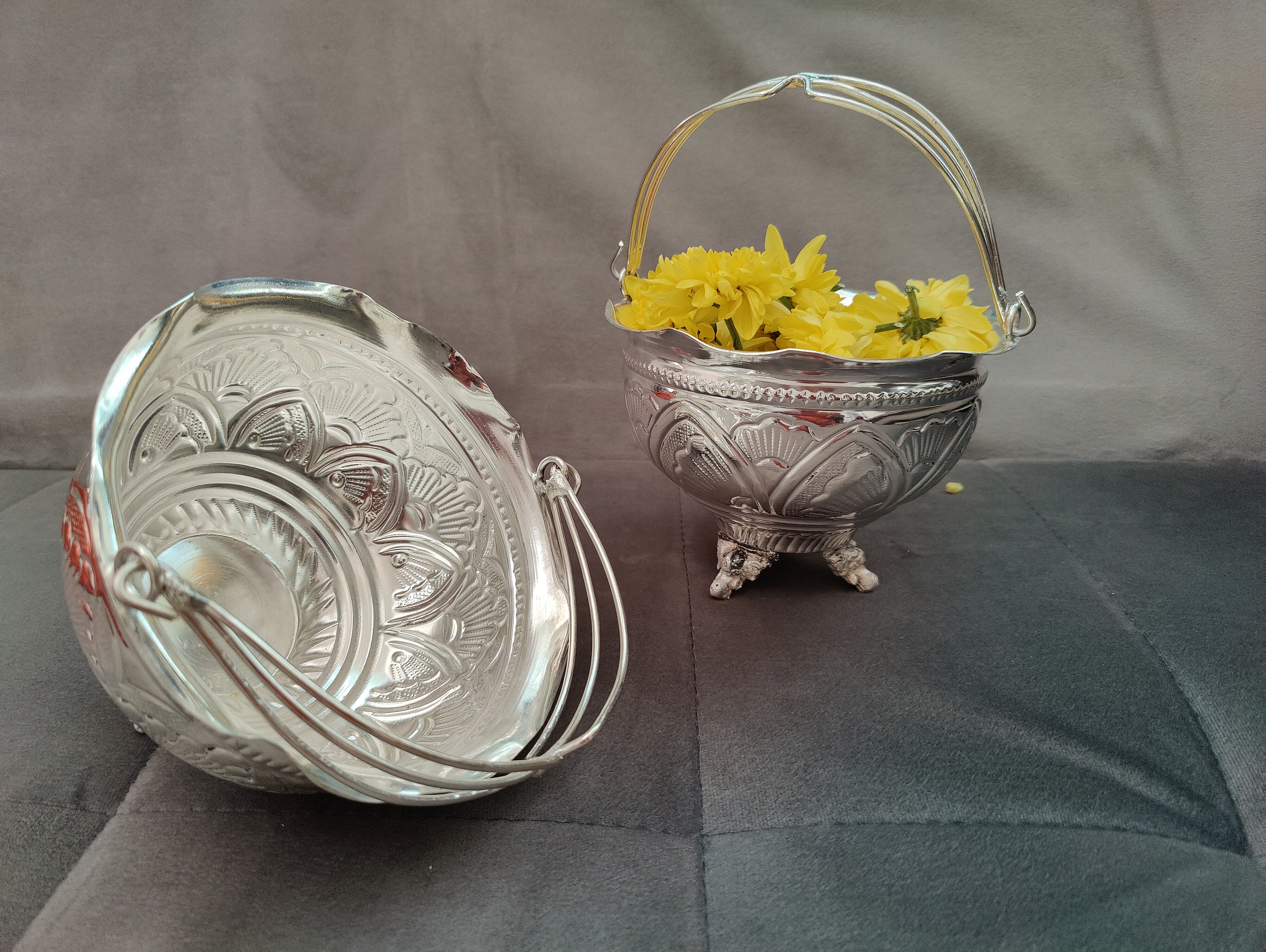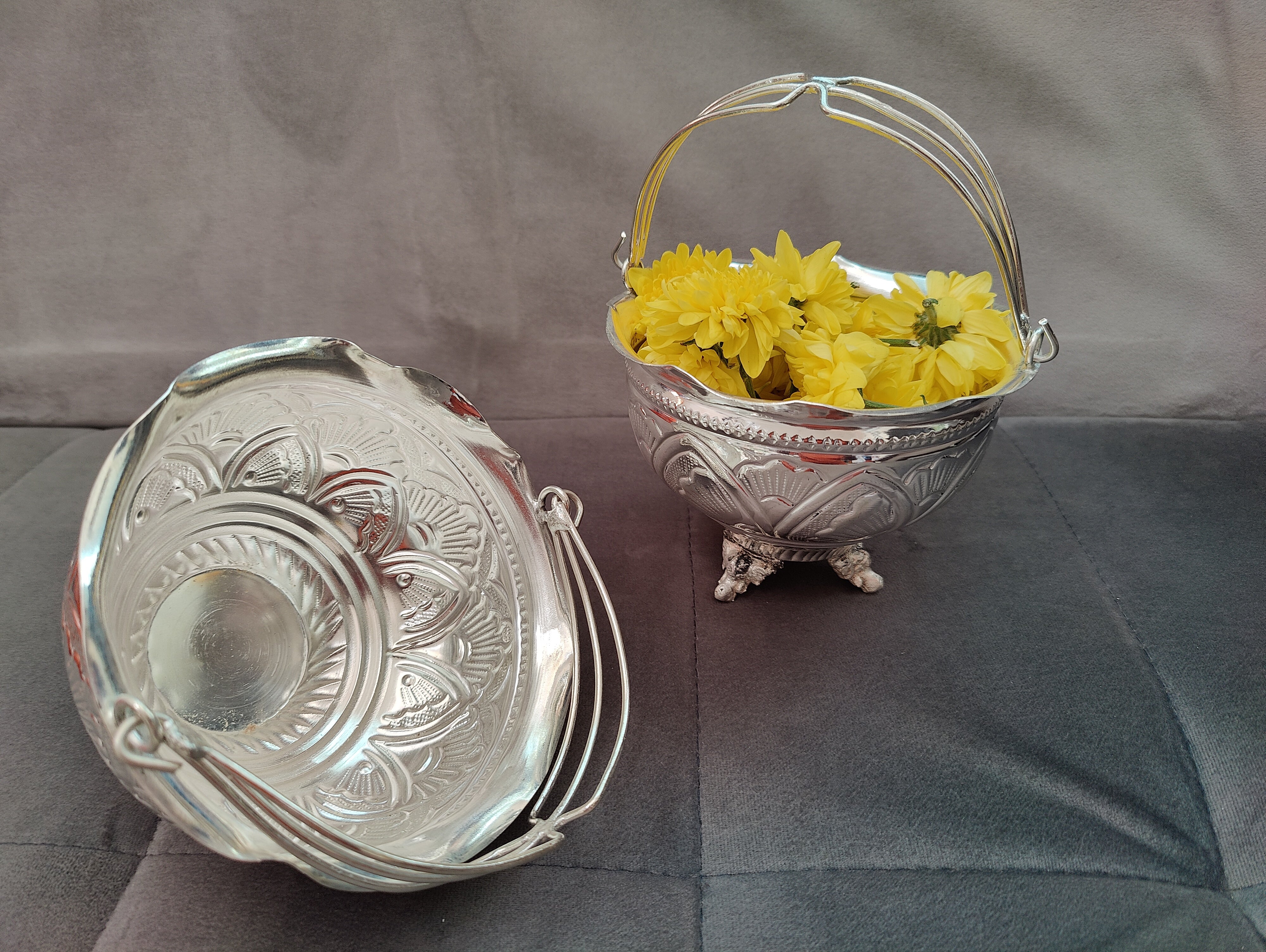 German silver washable flower basket with legs washable with colgate powder only ideal for return gifts for any occasion. Daily use possible