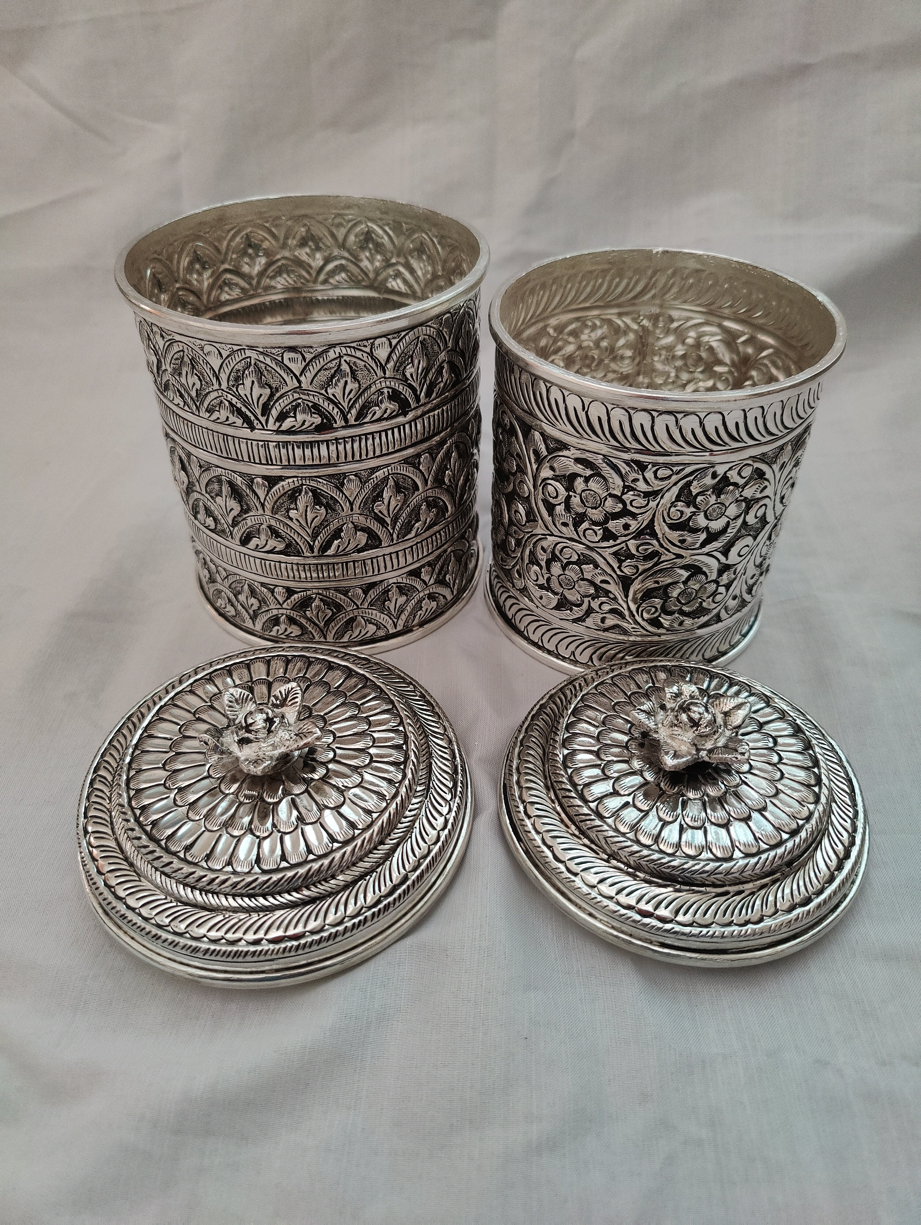 German silver washable nakshi work Done dry fruits dabbis set of 2 (big and medium size) storage boxes ideal for home decor Note (sgt antique German silver washable articles are pure silver polished) life time usable ideal for return gifts for any occasion. Daily use possible