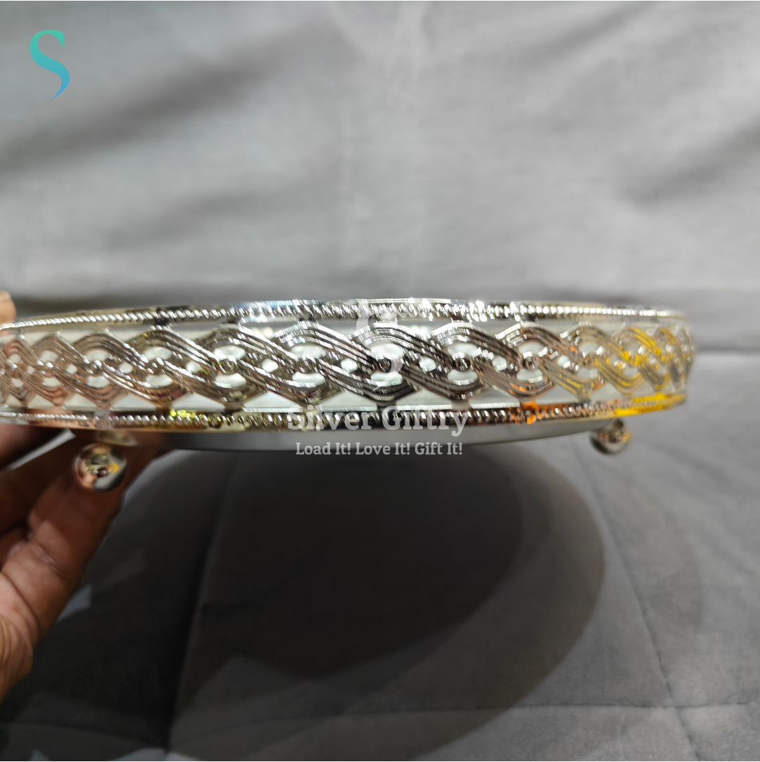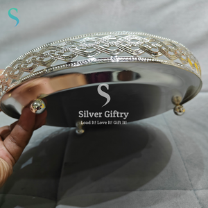 Imported German silver washable wedding tray 9inch with legs ideal for Pooja decor Note (washable with Colgate powder only) life time usable ideal for home pooja decor Daily use possible