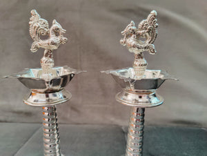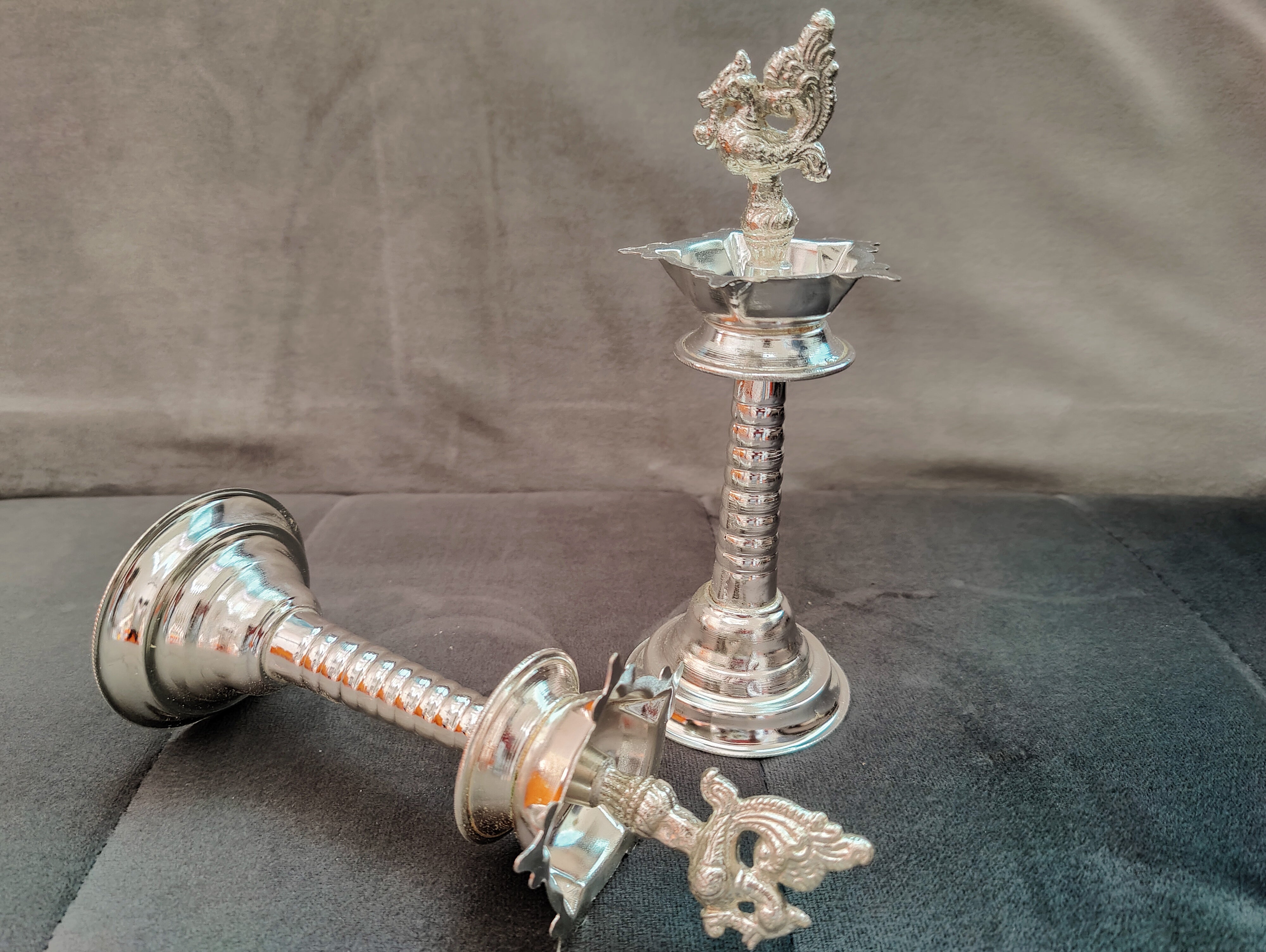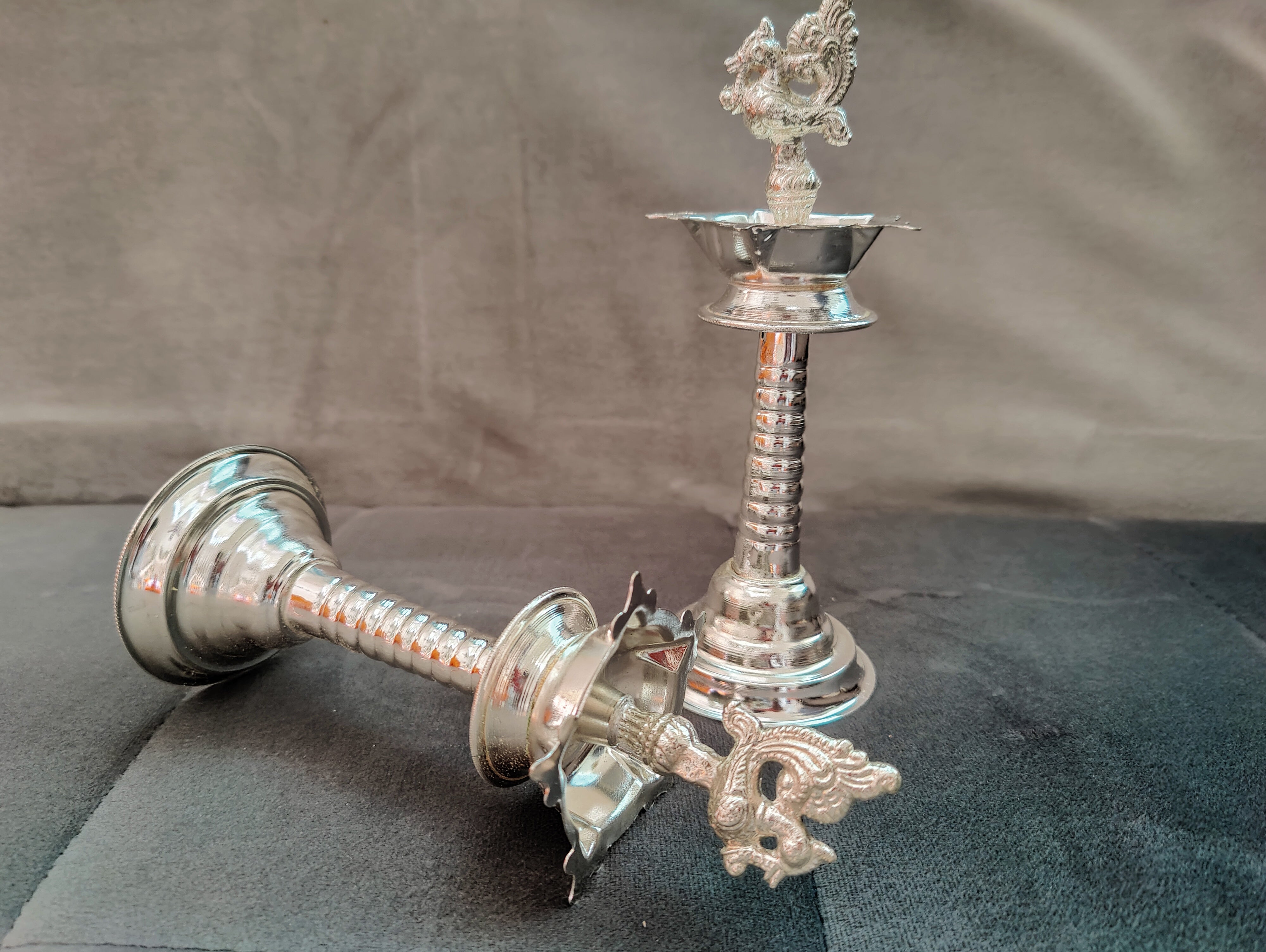 German silver washable malbar deeapam pair with peacock head washable with colgate powder only ideal for return gifts for any occasion Daily use possible