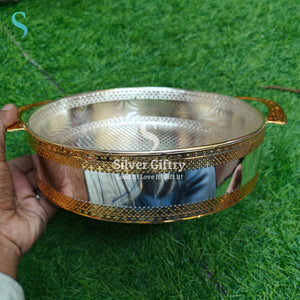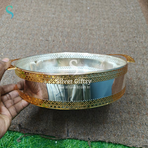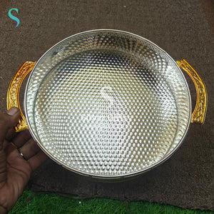 Imported German silver washable fancy designer tray with handle with gold and silver combination 12inch life time colour unchanging Washable life time usable ideal for home pooja decor Daily use possible