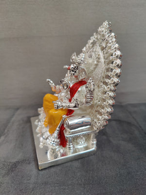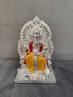 Pure silver coated maharaj ganesh idol with shimasana. Red and yellow on silver combination. idols ideal for home pooja decor ideal for return gifts for any occasion. Daily use possible