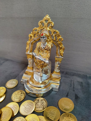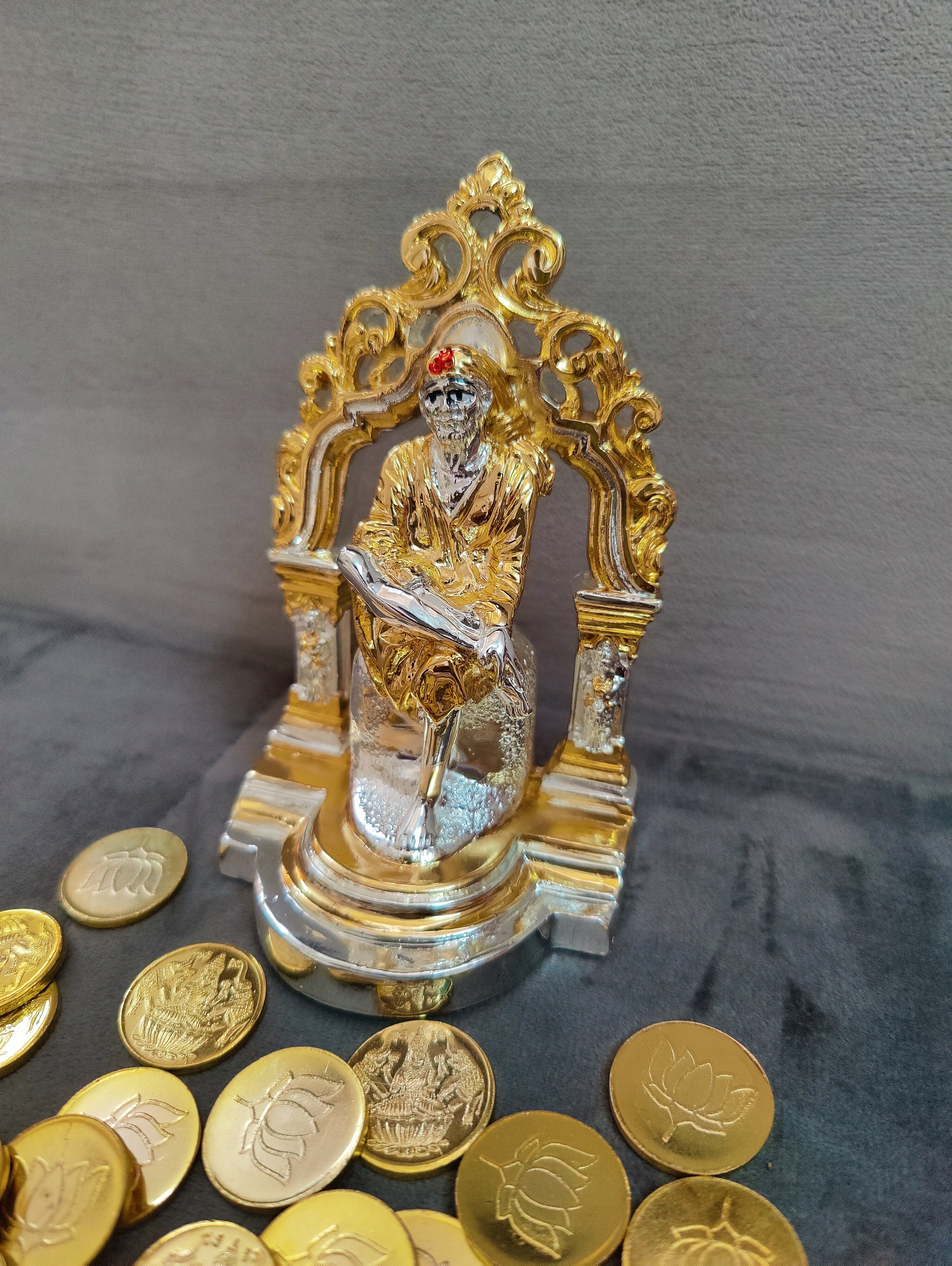 Pure silver coated siridi sai baba idol with gold and silver combination with 108 Mantra coins gold colour idols ideal for home pooja decor ideal for return gifts for any occasion. Daily use possible
