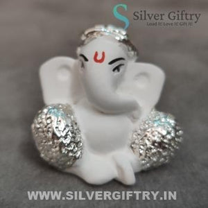 Imported Quality Pure Silver Coated Baby Ganesh Idol Ideal For Home Decor Or Car Dash Board Silver And White Combination