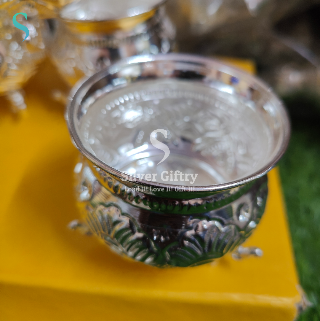 German silver washable Prasadam bowl with elephant stand ideal for home pooja decor + net bag + haldi Kum Kum. life time usable ideal for home pooja decor. Daily use possible