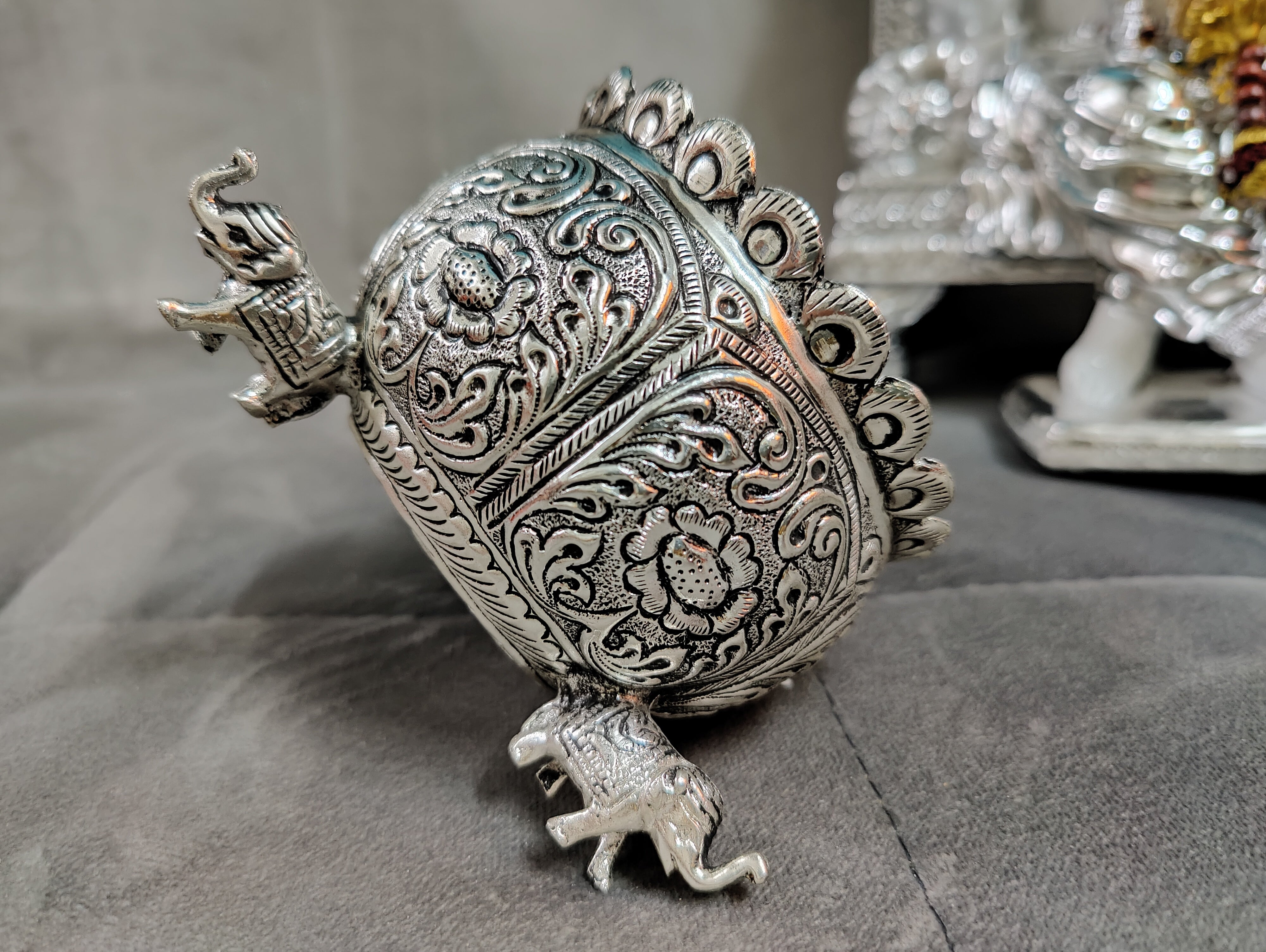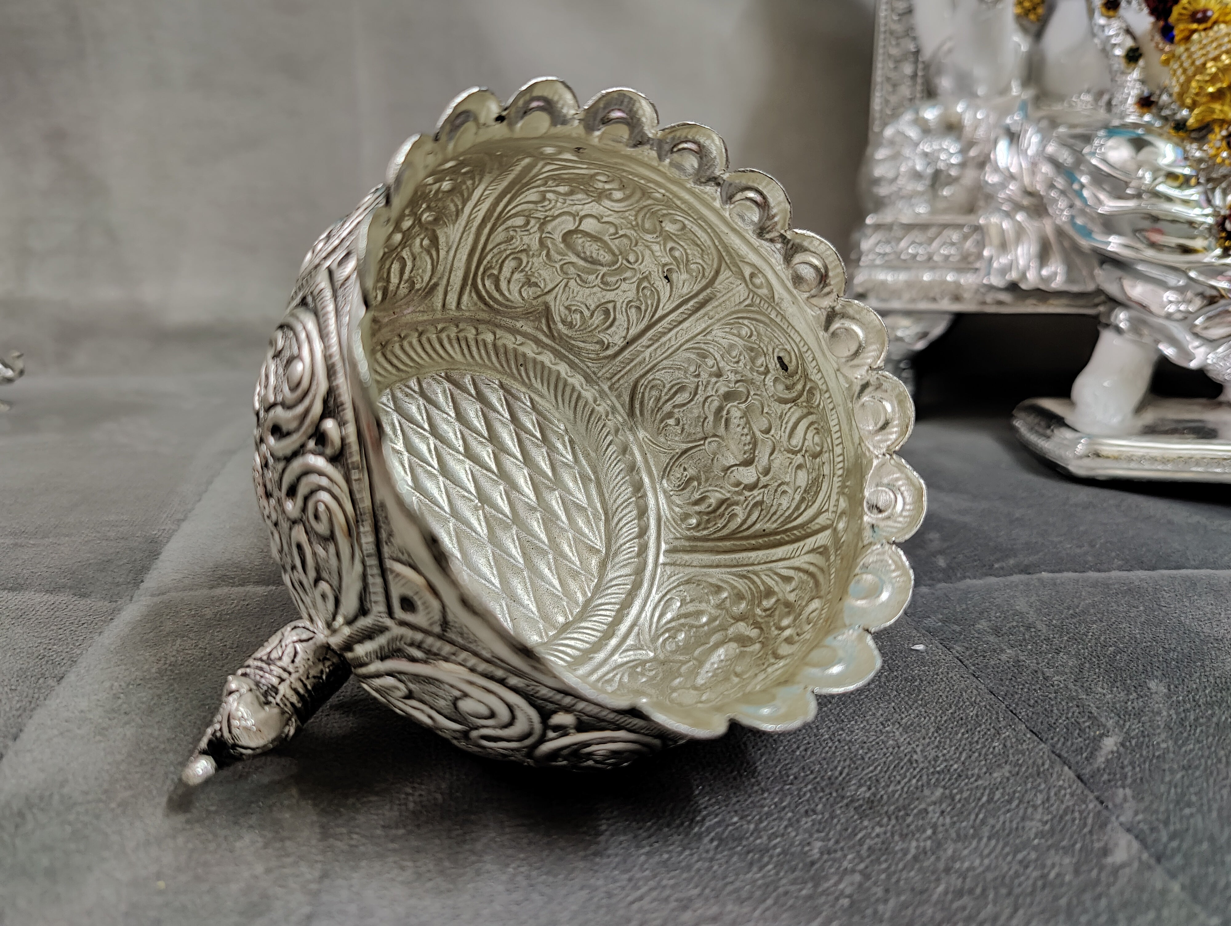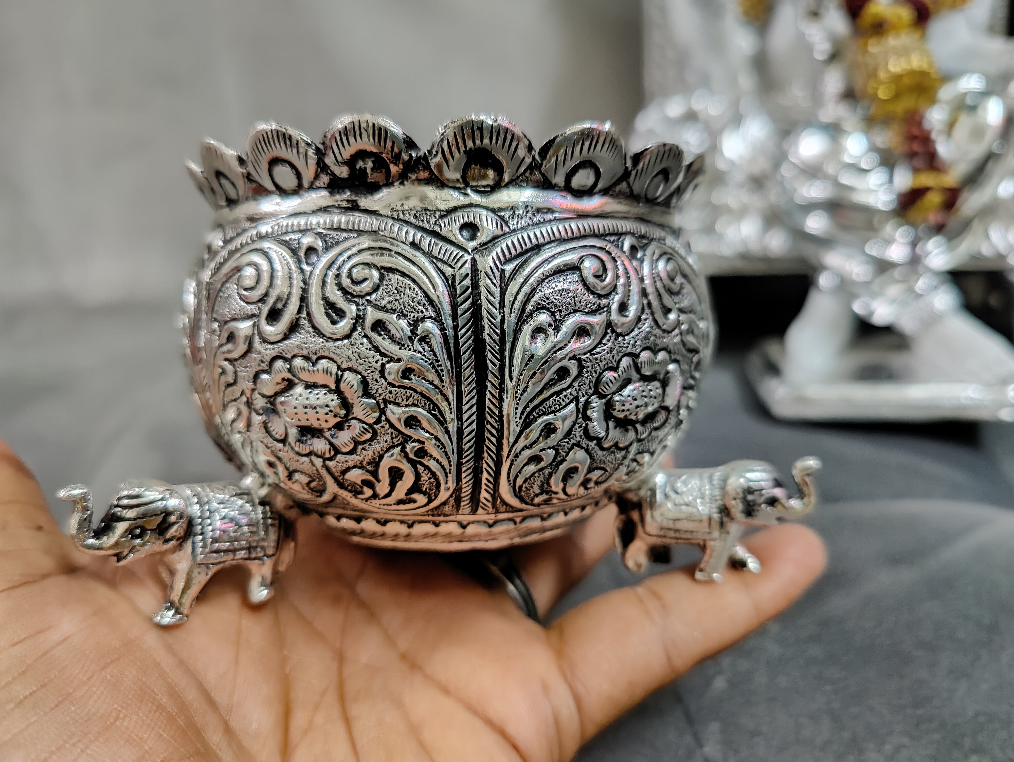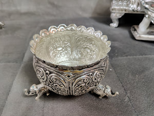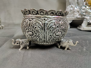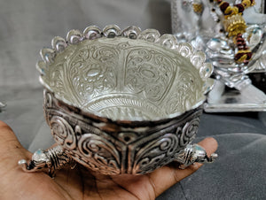 Antique German silver washable nakshi work Done elephant leg bowl fancy design big size ideal for wedding decor 4inch. Note (sgt antique German silver washable articles are pure silver polished) life time usable ideal for return gifts for any occasion. Daily use possible