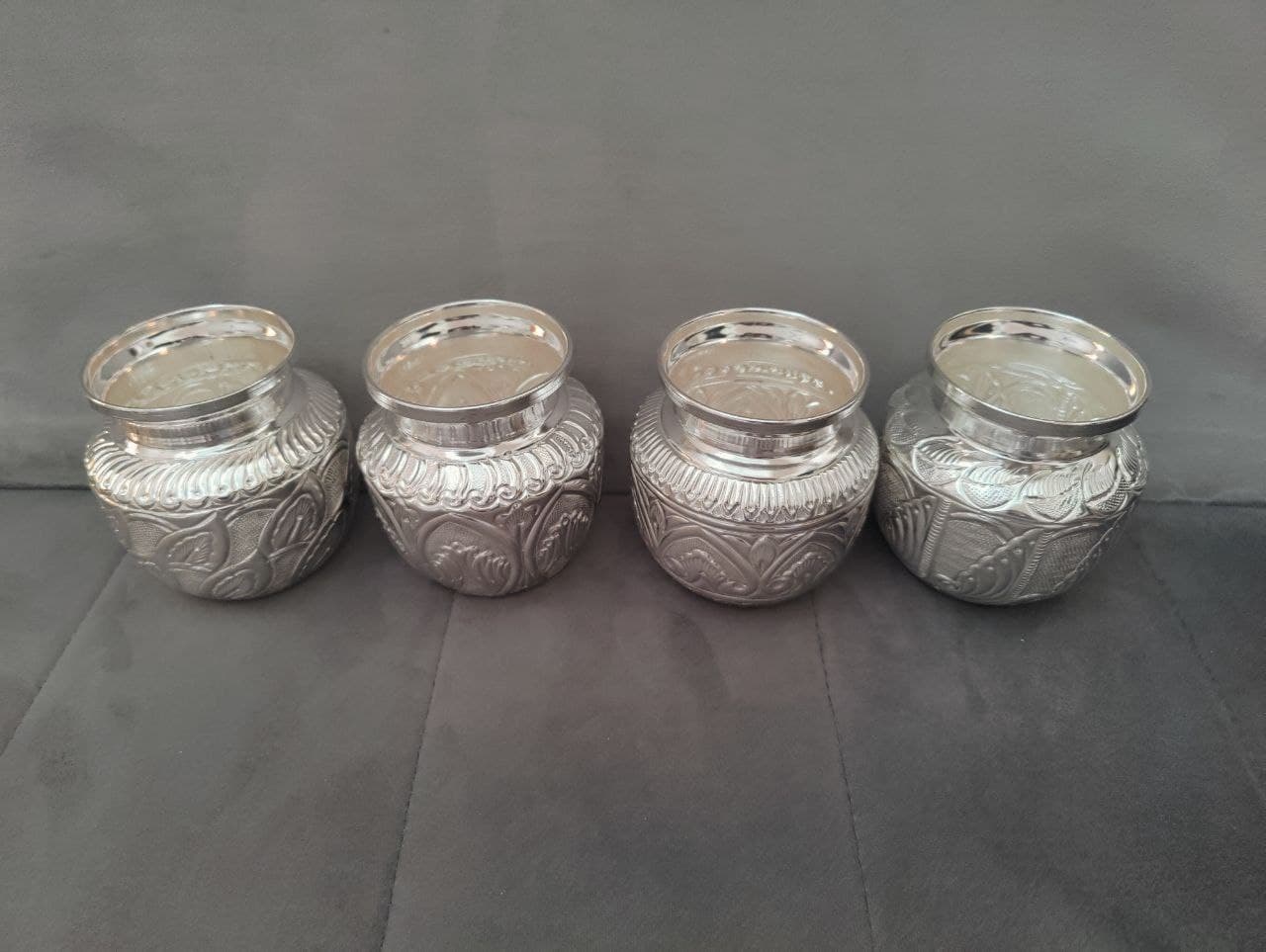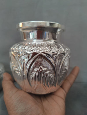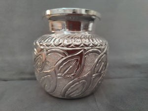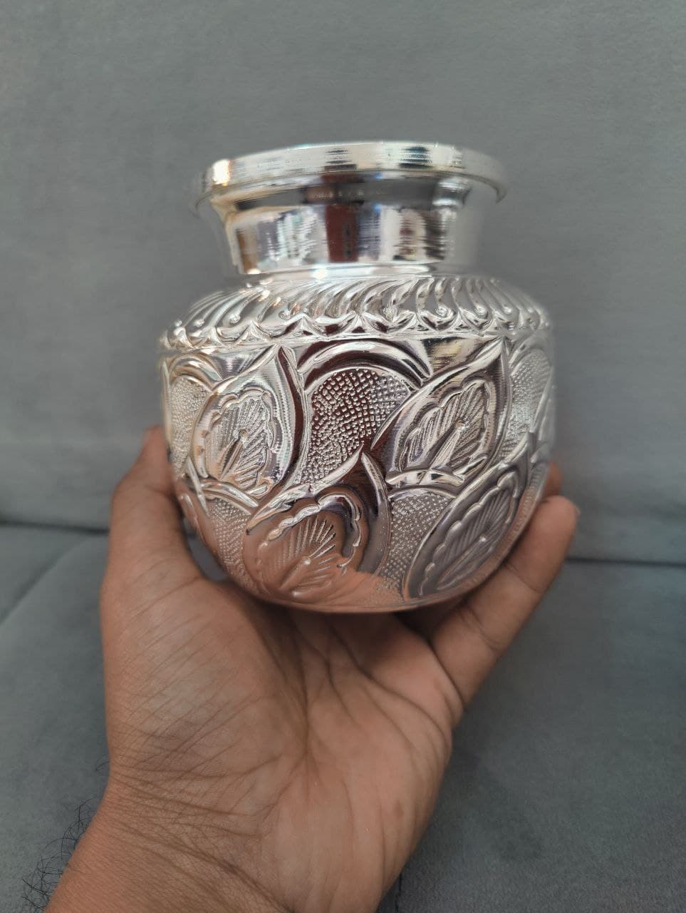 German silver washable fancy design kalsha (note the design on kalsha changes peice to peice hence it's hand made design). Capacity of 1ltr. Washable with colgate powder only. Daily use possible