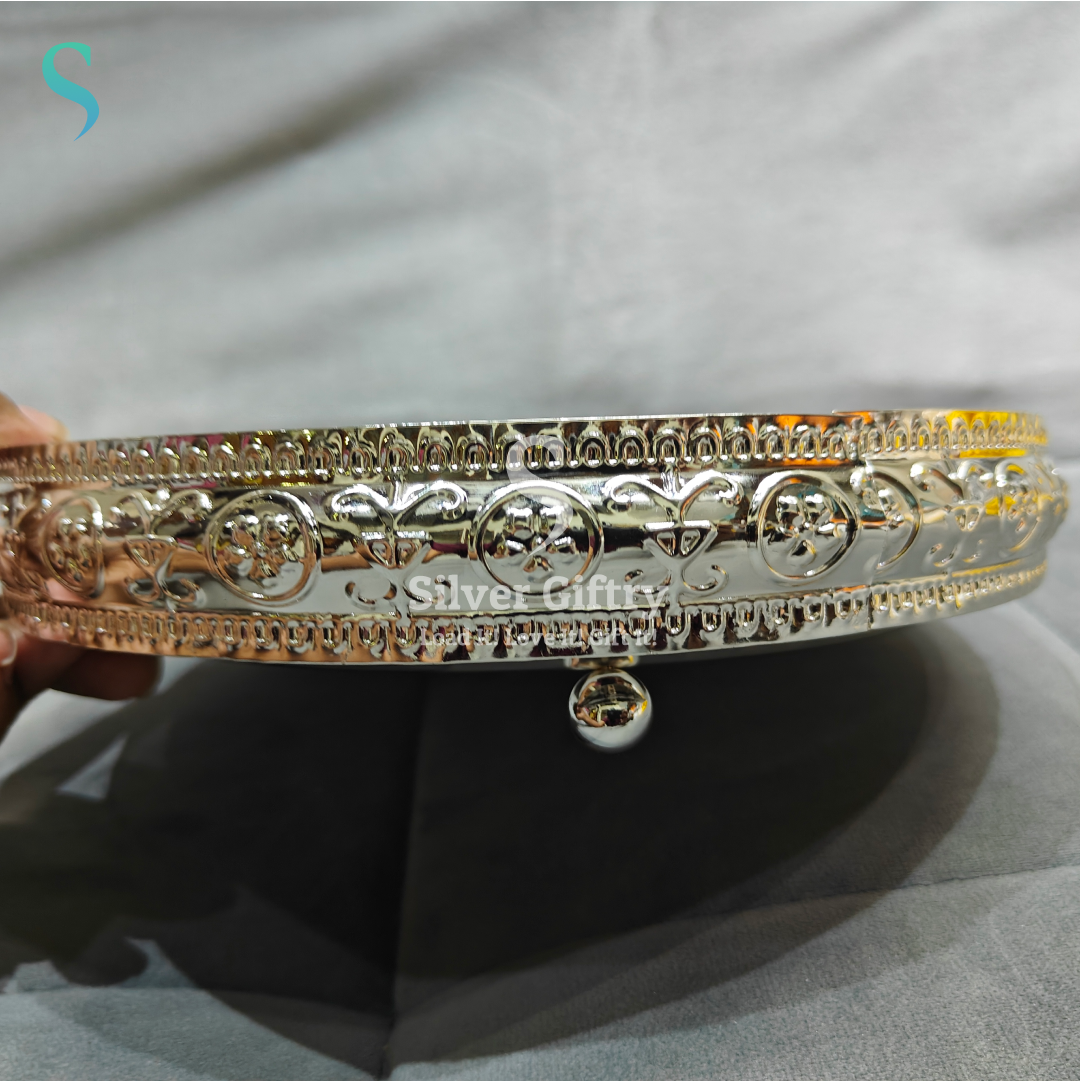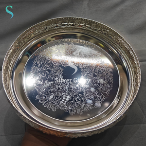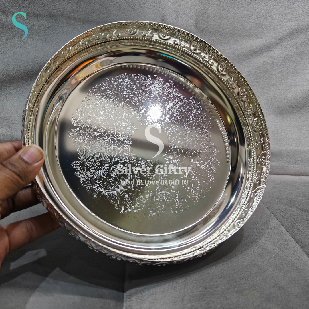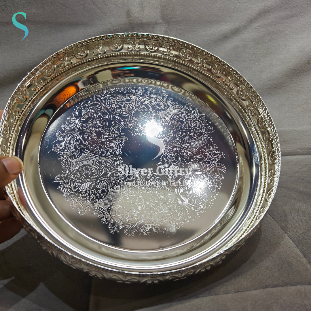 Imported German silver washable wedding tray 9inch with legs ideal for Pooja decor Note (washable with Colgate powder only) life time usable ideal for home pooja decor Daily use possible