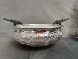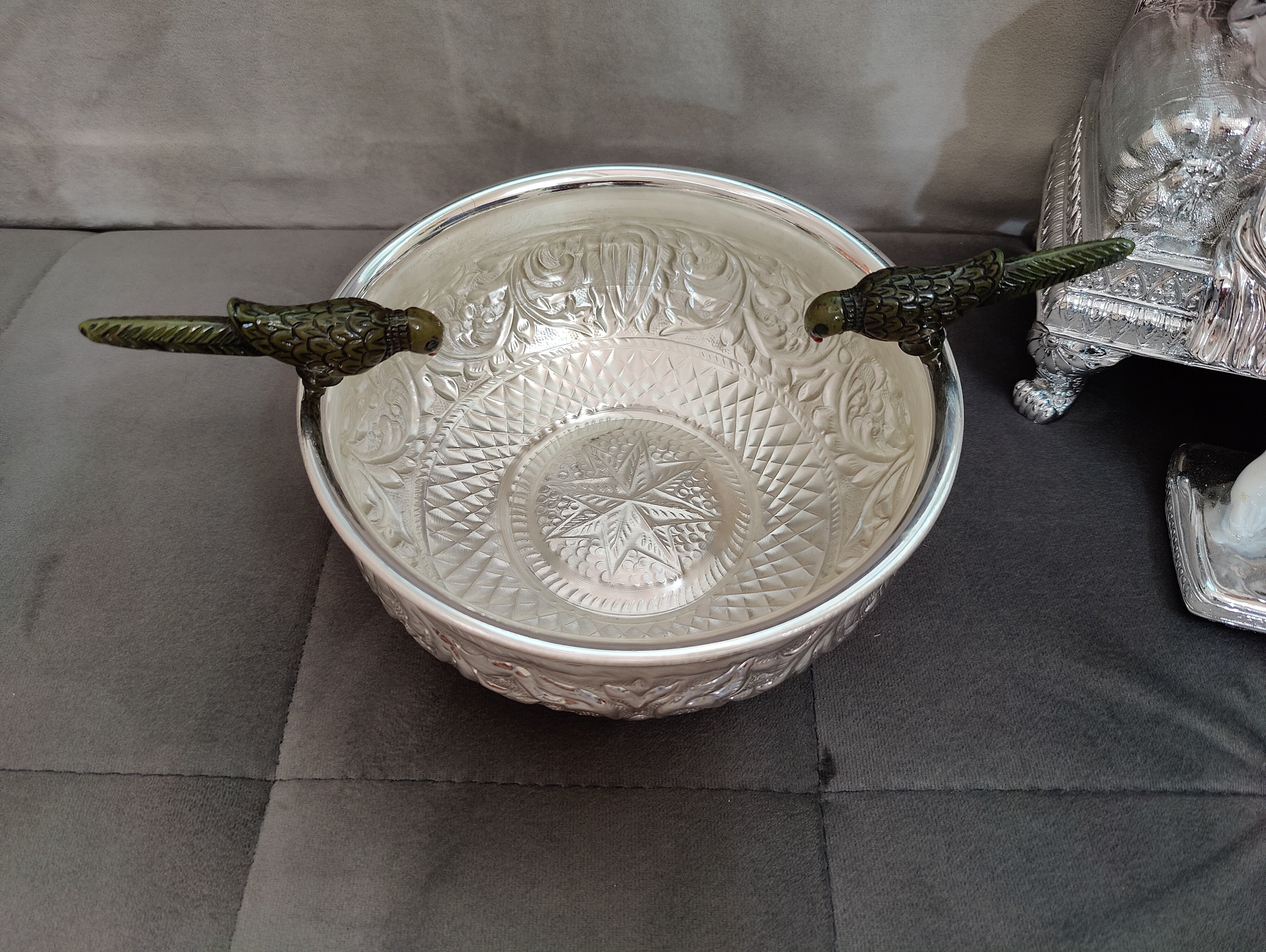 Imported German silver washable big size prasad bowl parrot urli ideal for wedding decor 6inch sized washable with colgate powder only ideal for return gifts for any occasion. Daily use possible