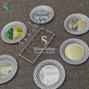 Imported German silver washable fancy design plates with stand set of 6 plates 4inch with stand life time colour unchanging Washable life time usable ideal for home pooja decor. Daily use possible