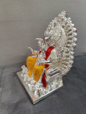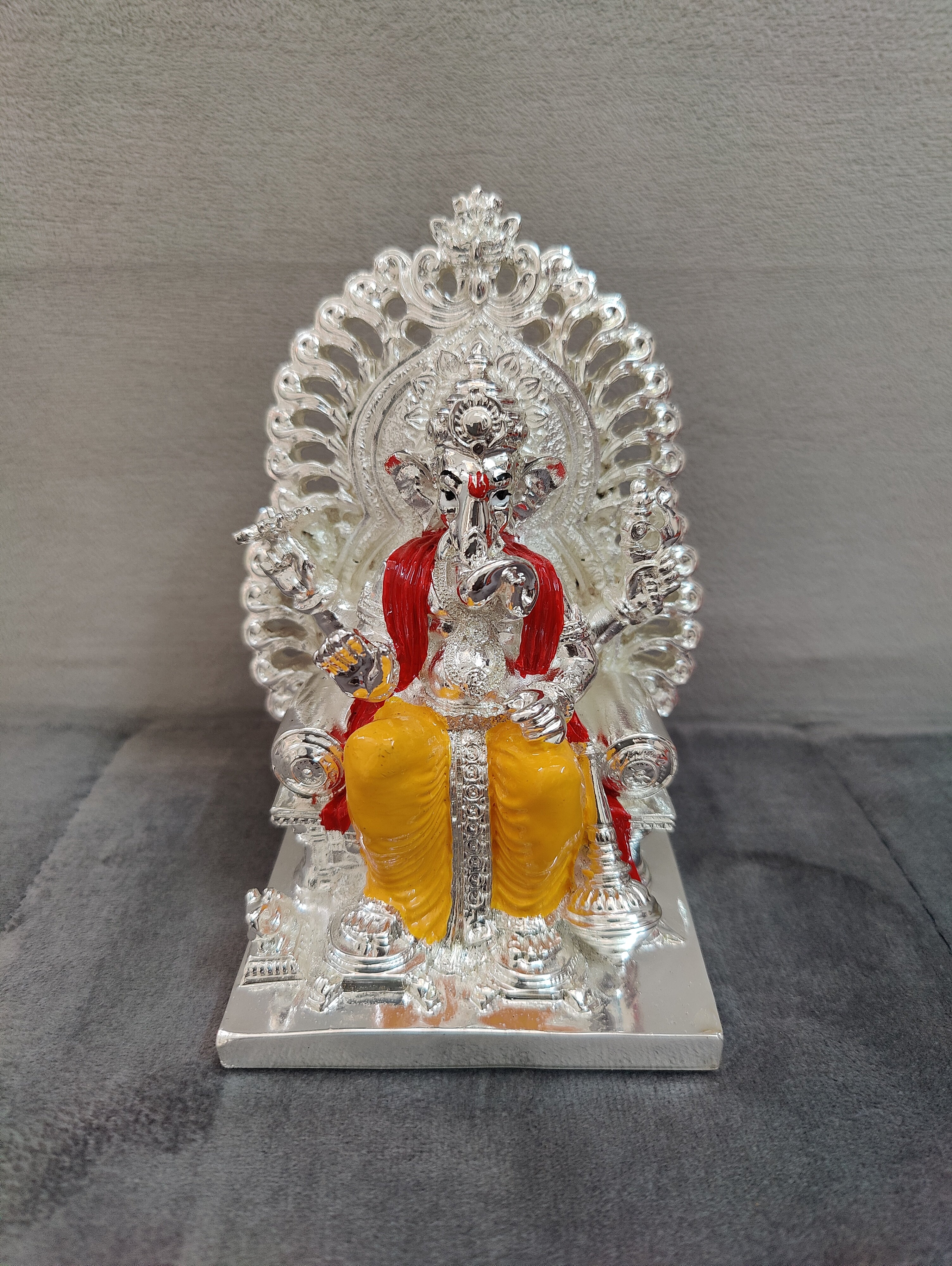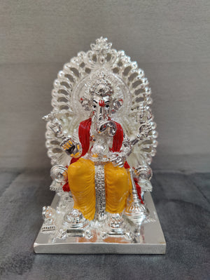 Pure silver coated maharaj ganesh idol with shimasana. Red and yellow on silver combination. idols ideal for home pooja decor ideal for return gifts for any occasion. Daily use possible
