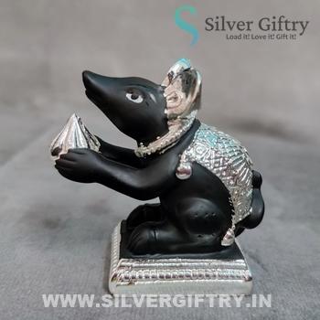 Imported Quality Pure Silver Coated Rat With Modal Idol Black And Silver Combination Ideal For Ganesh Pooja Festival